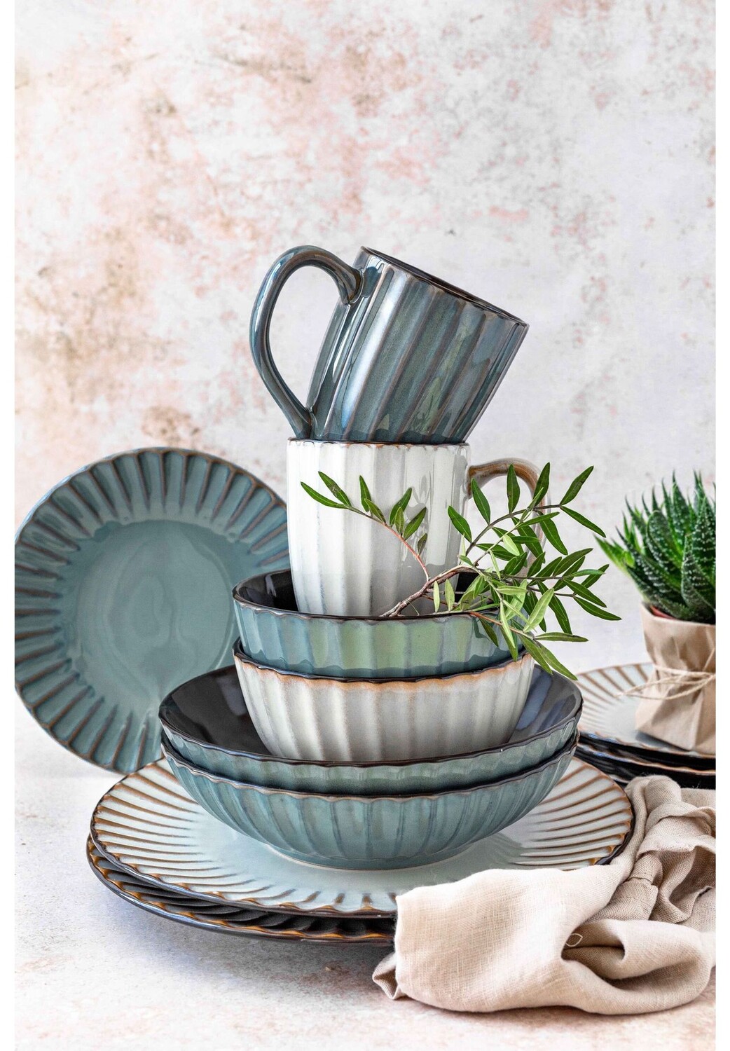 Описание изделия: Захватывающее сочетание круглых ретро-форм с волнистым рельефом, с одной стороны, и современной техники неравномерной глазури с черными акцентами, с другой стороны, придает коллекции посуды «Confino» особую элегантность. Серия керамической посуды традиционного австрийского бренда MÄSER изготовлена ​​из высококачественного керамогранита, который не следует путать с гораздо более хрупким керамогранитом. Естественные цветовые вариации этой коллекции гармонично сочетаются друг с другом. Этот набор поставляется в упаковке для посылок, изготовленной из экологически чистых материалов, неоднократно проверенных на устойчивость к поломке. Обратите внимание: эта коллекция красочно глазурована вручную, поэтому неровности глазури минимальны. могут встречаться небольшие включения и незначительные изменения цвета. Для лучшей объективной сопоставимости наша информация о количестве наполнения предполагает, что контейнер заполнен до краев. Этот современный набор посуды состоит из: 4 плоских тарелок 27 см 4 глубоких тарелок 20,5 см 4 десертных тарелок 20 см 4 мисок 15 см 4 кофейных кружек 350 мл