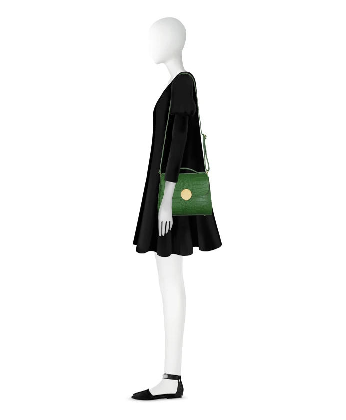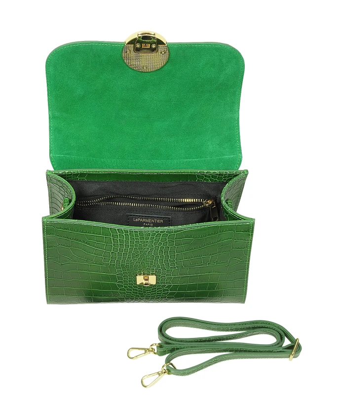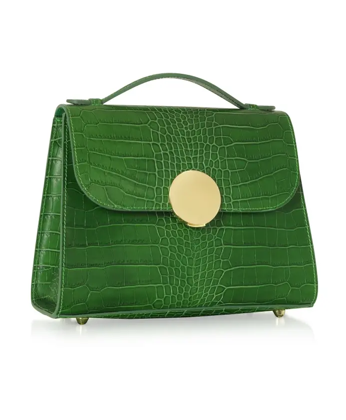 Добавьте нотку винтажного гламура в свой образ с помощью сумки-сэтчел Le Parmentier Bombo из кожи с тиснением под крокодила и верхней ручкой. Эта изысканная сумка, изготовленная с безупречным мастерством, оснащена клапаном на кнопке и фурнитурой геометрической формы. Он оснащен верхней ручкой и съемным ремешком, поэтому при необходимости вы можете держать руки свободными. Сумка также имеет внутренний карман на молнии, защитные ножки и золотистую фурнитуру. Изготовлено вручную в Италии из высококачественной кожи с тиснением под крокодила. Его размеры 25 x 18 x 10 см — это идеальный размер для всего самого необходимого.