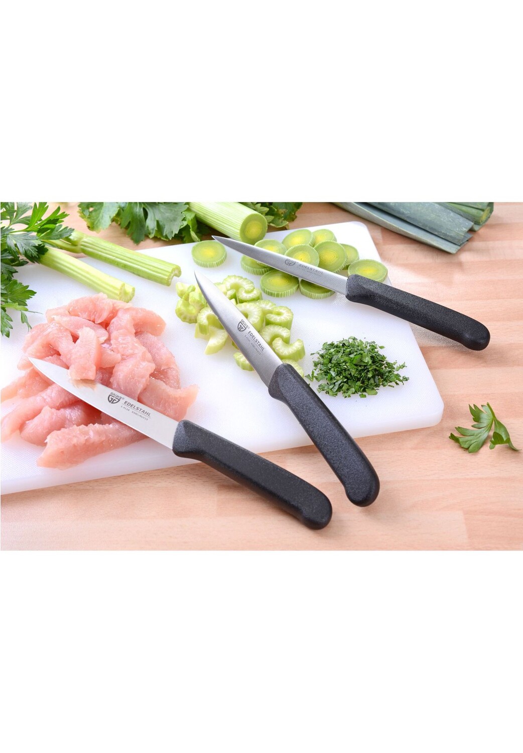 Описание предмета: Нож для овощей с цветными ручками для нарезки таких продуктов, как перец или кабачки. Лезвие изготовлено из нержавеющей стали 1.4116, ручки из пластика. Комплект поставки: 3 ножа для овощей с ручкой. Длина: ок. 20,5 см, лезвие ок. 10 см, вес (1 нож) ок. 29 г.
