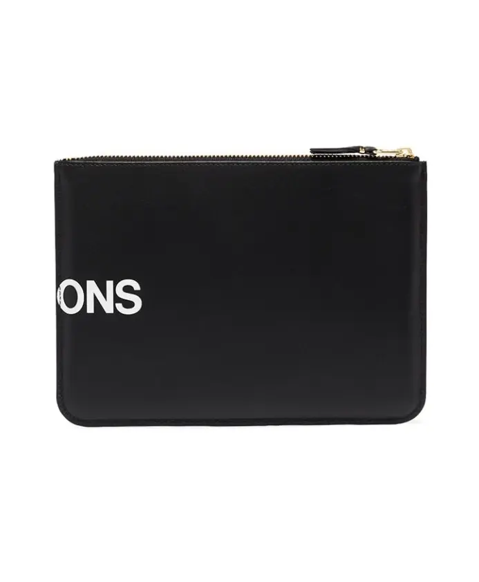 Обновите свой стиль с помощью этой мужской сумки Comme des Garçons. Этот аксессуар выполнен из черной гладкой кожи с белым логотипом, напечатанным с обеих сторон, имеет золотистую фурнитуру, застежку-молнию сверху и черную кожаную подкладку. Дизайн дополнен тисненым логотипом спереди.