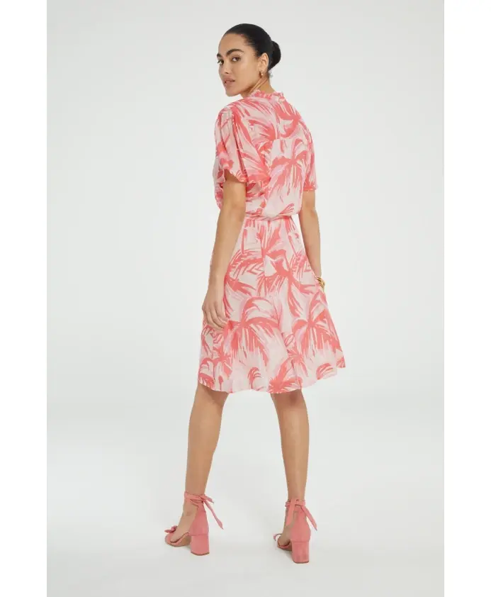 Короткое платье с воротником-стойкой с рюшами, поясом на талии и планкой на пуговицах во всю длину. Платье Myle Butterfly имеет короткие рукава-бабочки и украшено стильным принтом Palmeraie по всей поверхности.