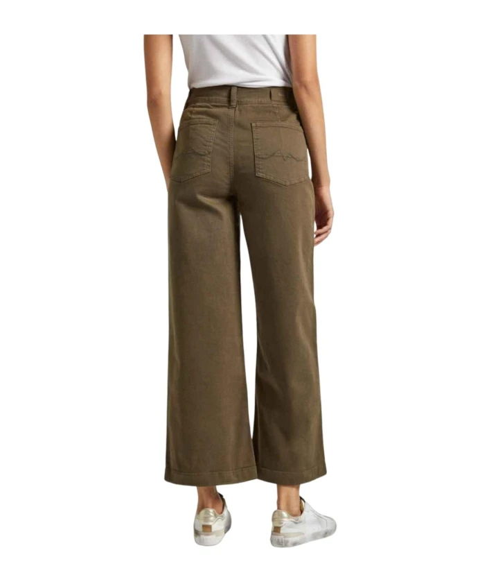 Эти зеленые брюки Pepe Jeans сочетают в себе стиль и комфорт. Эластичная хлопчатобумажная ткань обеспечивает удобную и гибкую посадку, а крой-кюлот и широкие штанины создают современный и элегантный силуэт. Вышивка на задних карманах добавляет смелости дизайну, а высокий пояс создает классический и привлекательный образ. Застегиваются на молнию и пуговицу, а также накладные задние карманы. Эти брюки выглядят стильно и практично.