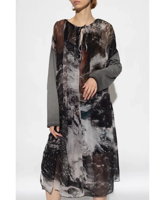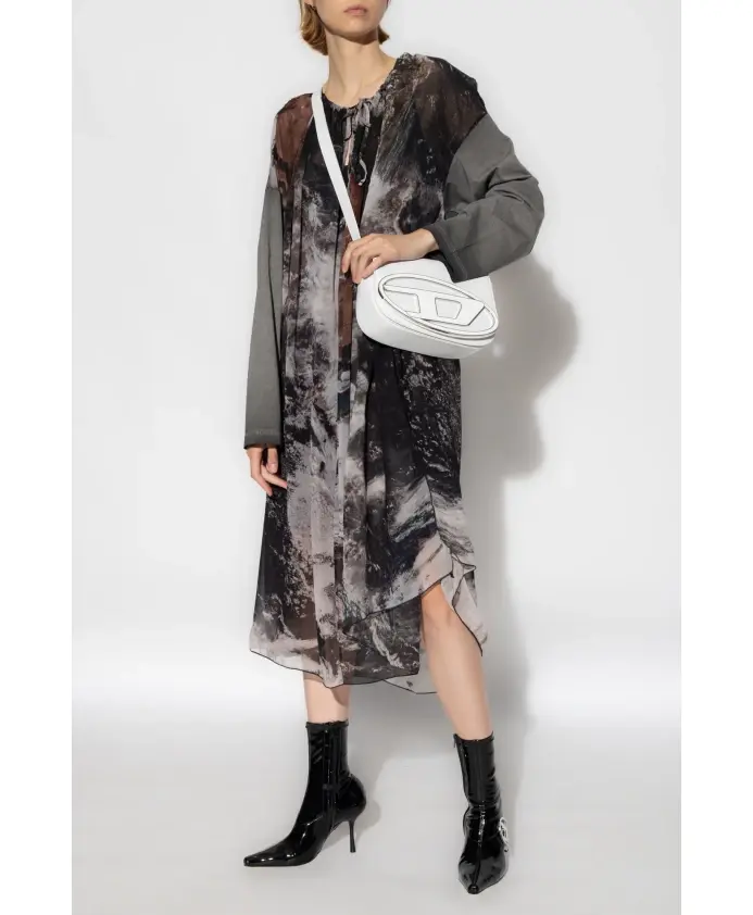 Серо-Черно-Коричневое платье D-LAV от Diesel. Эта модель свободного кроя, украшенная рисунком, имеет завязывающийся воротник, длинные рукава и темно-синюю хлопковую подкладку с бретелями. Размеры модели: Рост: 176 см. Грудь: 85 см. Талия: 60 см. Бедра: 89 см. На модели размер одежды: 40.