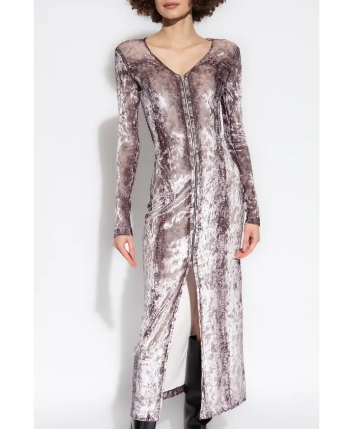 Серое платье D-MARTEL от Diesel. Эта модель из бархата приталенного силуэта застегивается на двустороннюю молнию спереди и украшена принтом Trompe LOeil, который создает визуальную иллюзию обработанного денима. Имеет V-образный вырез и длинные рукава.Размеры моделиРост: 176 см. Грудь: 85 см. Талия: 60 см. Бедра: 89 см. На модели размер одежды: XS.