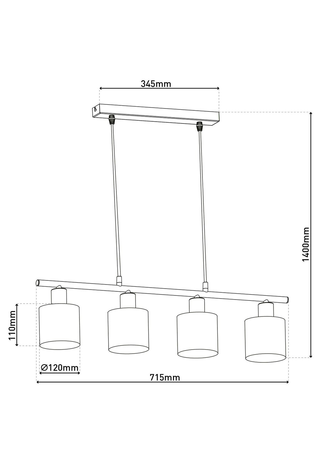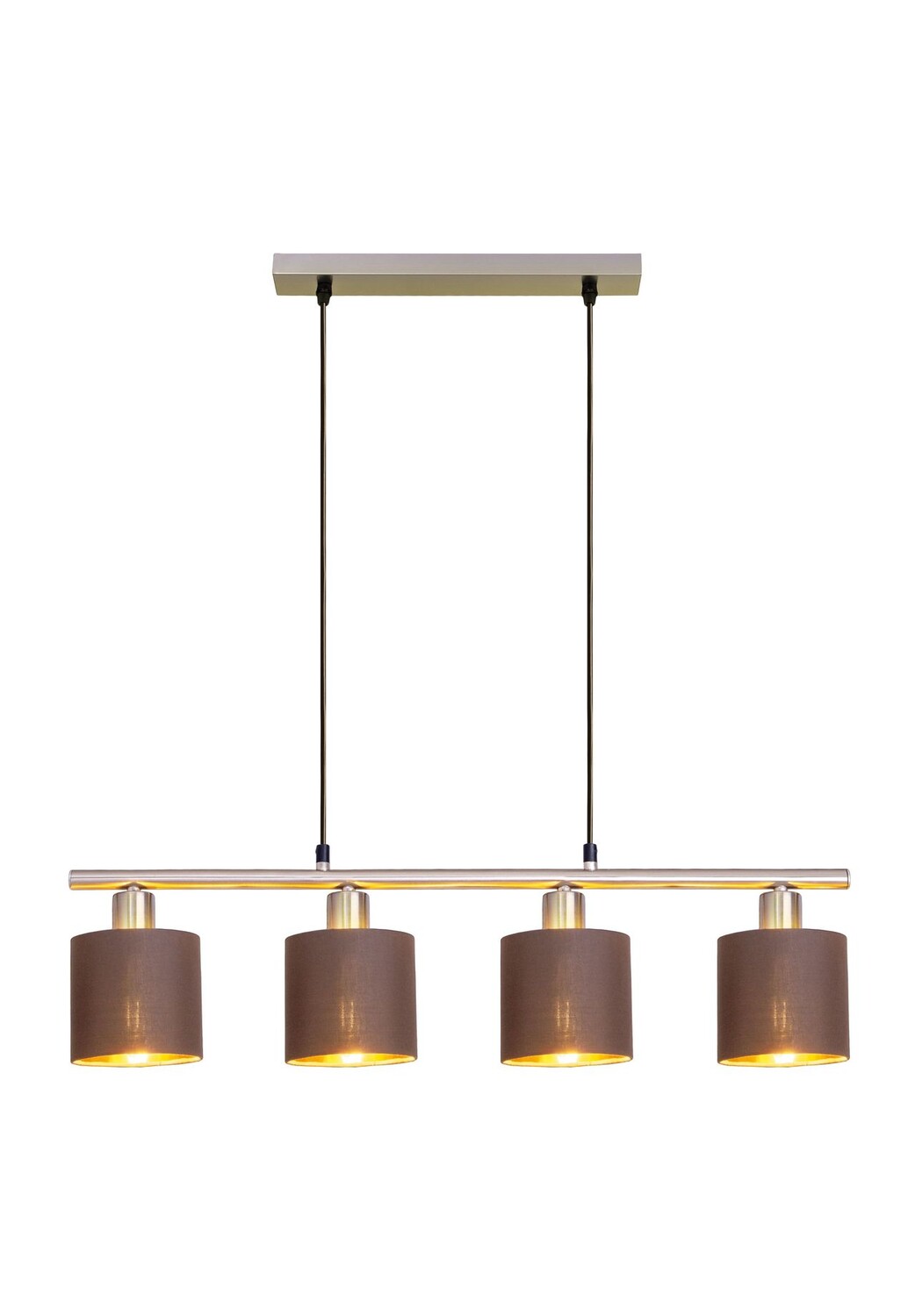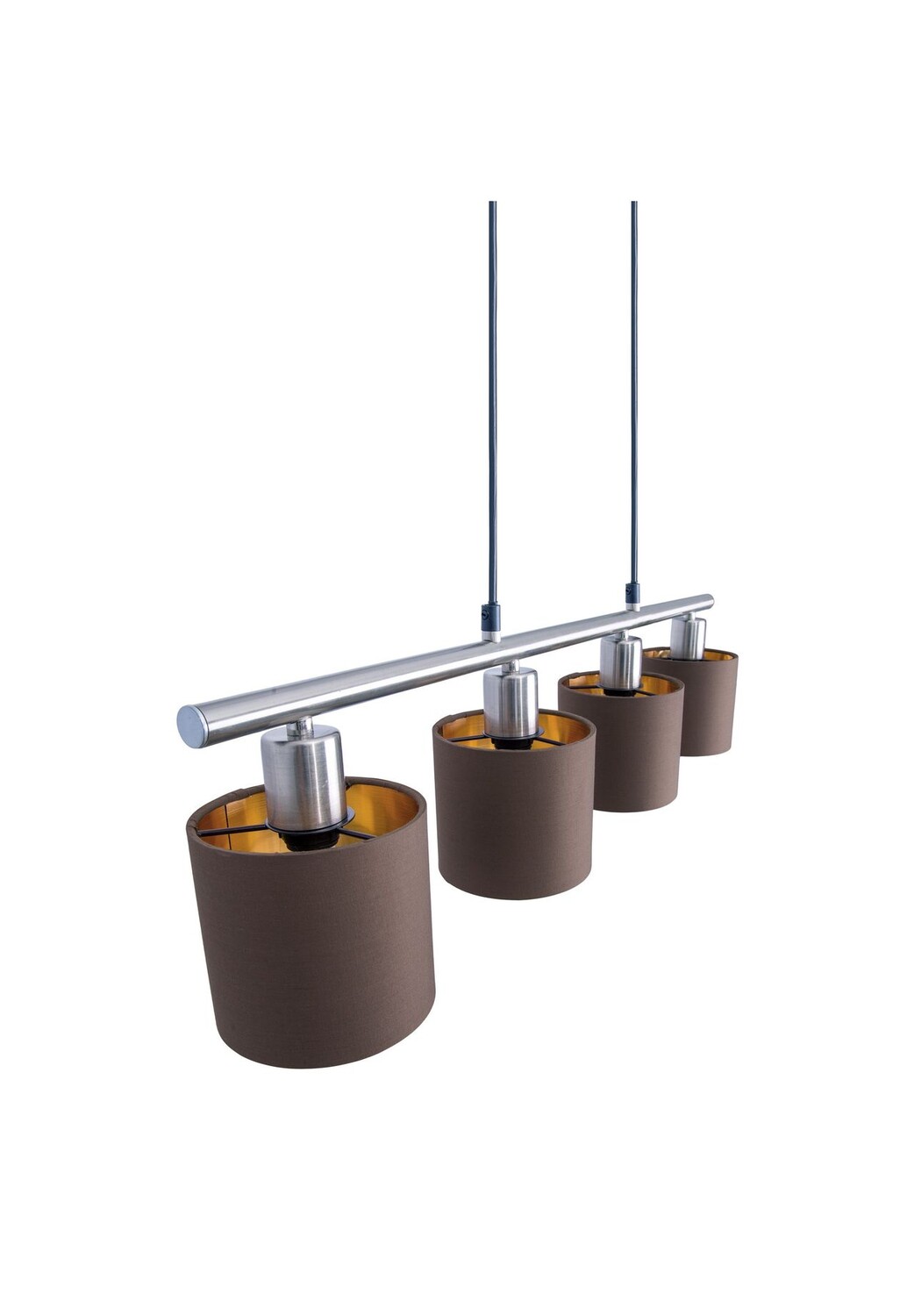Макс. 4x E14. 40 Вт искл. Источник света 220–240 В~ 50 Гц IP20/SKI Всего: длина: 72,4 см; б: 12см; высота: 15 см, общая высота: 140 см, оттенок: г: 12 см; высота: 11 см, капюшон: длина: 34,5 см; б: 4,5 см; час: 2 5см Длина маятника: 120см Материал: сталь, текстиль Абажур: металл: 70% / ТК: 8% / ПВХ: 22% Цвет: коричневый; внутри: золото; сатинированный никель