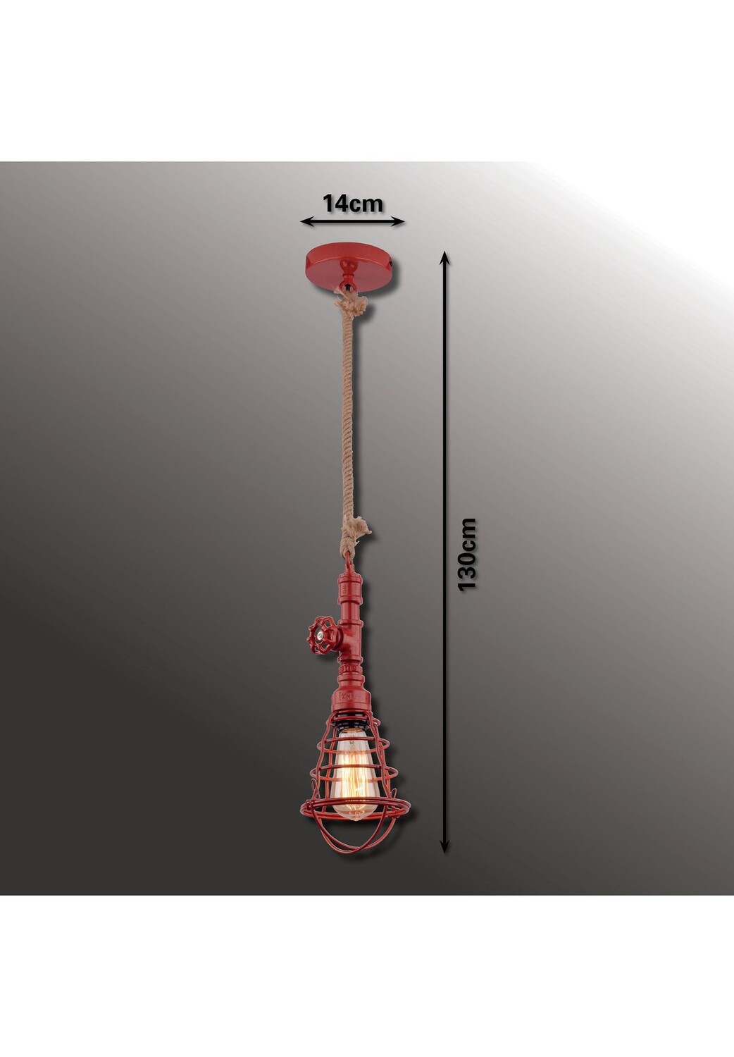 Подвесной светильник «Regia» имеет диаметр 14 см и высоту 36 см. Общий размер, включая маятник, составляет 130 см. Он изготовлен из красного металла и веревки натурального цвета.