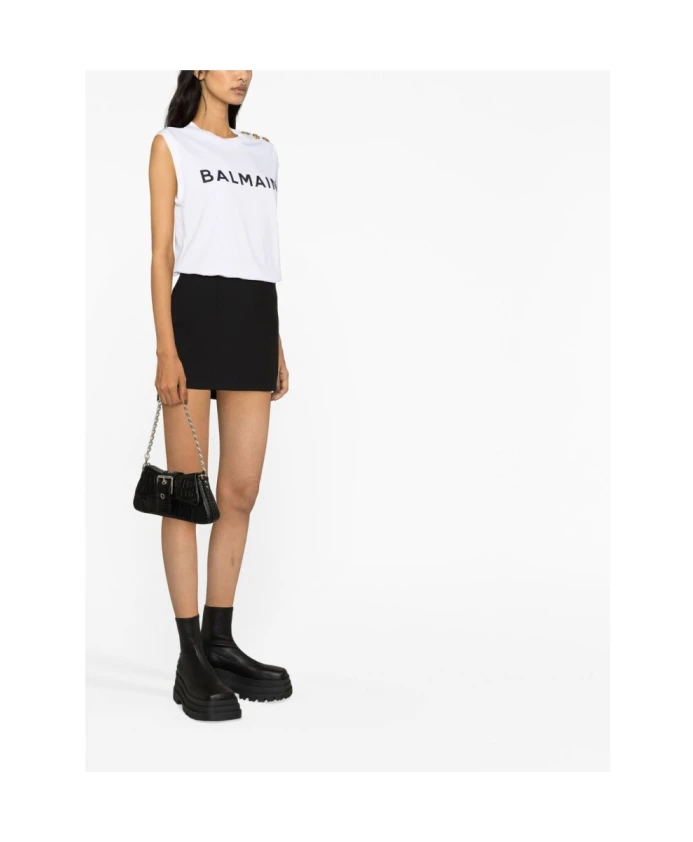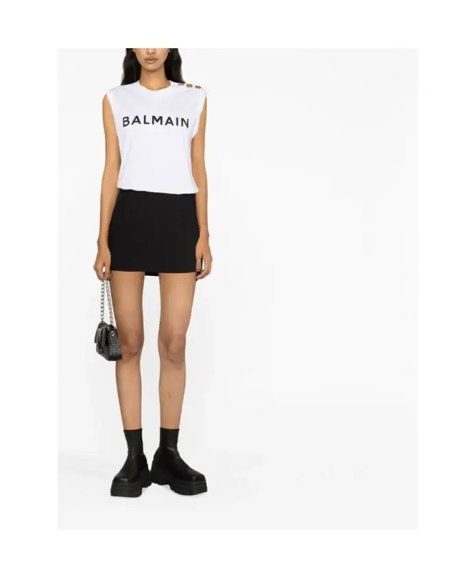 Обновите свой гардероб этим шикарным топом без рукавов Balmain. Эта белая футболка изготовлена из 100% органического хлопка и имеет черный принт с логотипом Balmain, круглый вырез, золотые пуговицы с тиснением на плече и свободный крой.
