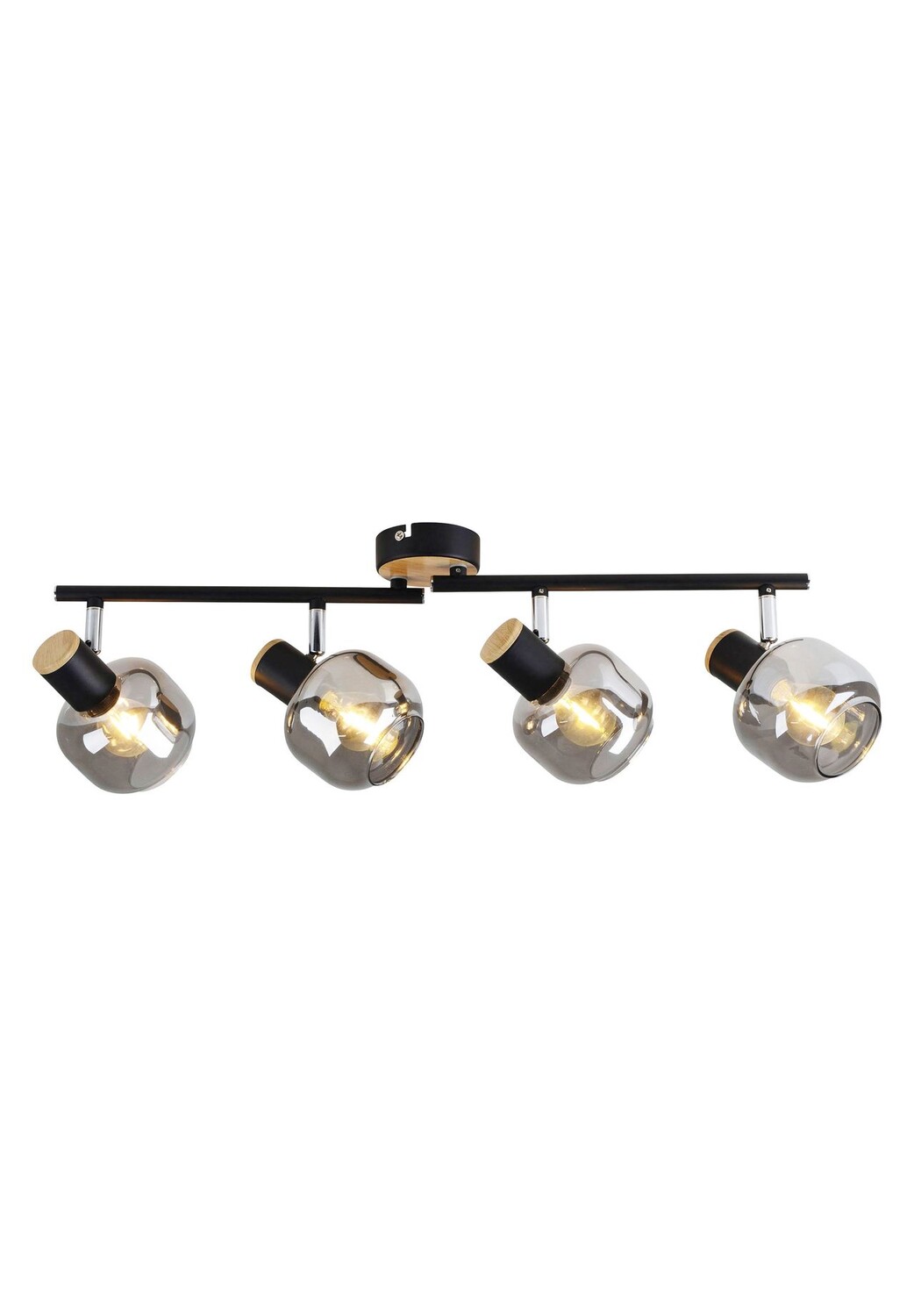 4-точечный потолочный светильник диаметром около 10 см. Изготовлен из черного металла с акцентами из натурального и тонированного стекла. также называемое дымчатым стеклом.