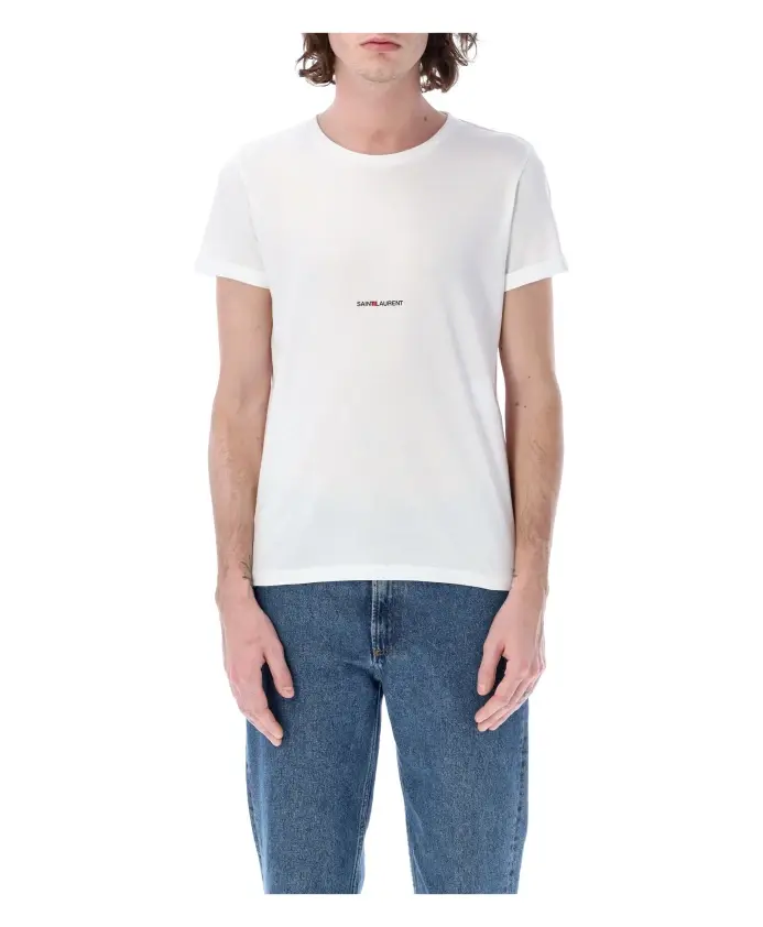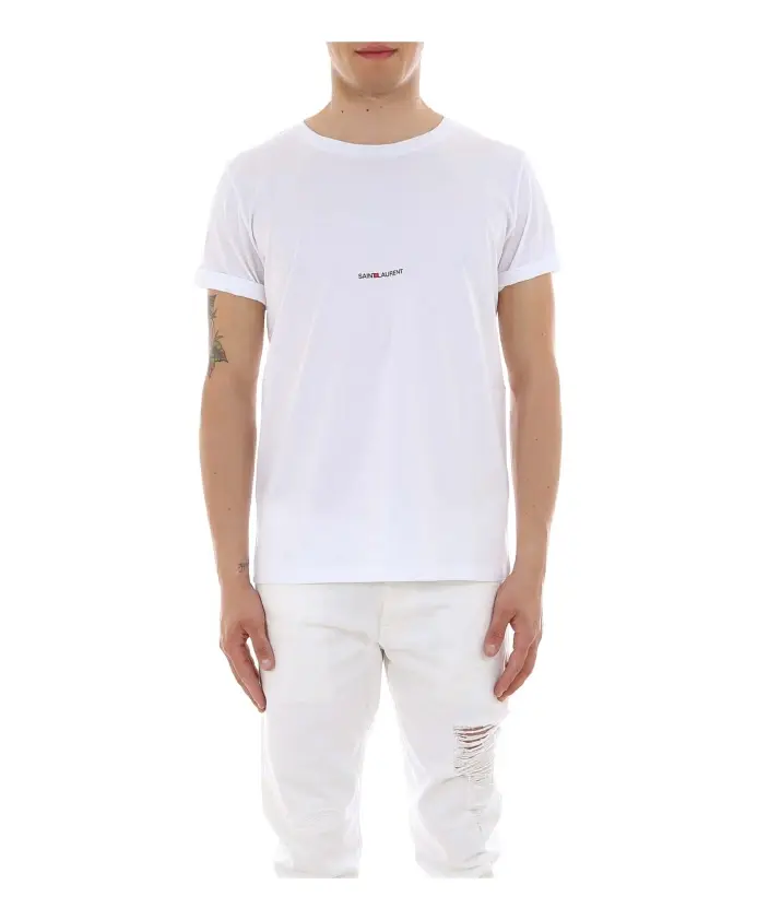 Обновите свой повседневный гардероб этой классической футболкой с круглым вырезом от Saint Laurent. Эта белая футболка Rive Gauche изготовлена из 100% хлопка и украшена принтом на груди культового логотипа Saint Laurent. Эта рубашка с микрорезинчатым воротником и необработанным краем спинки сочетает в себе стиль и комфорт. Добавьте нотку изысканности в свой образ с помощью этой вневременной базовой модели.