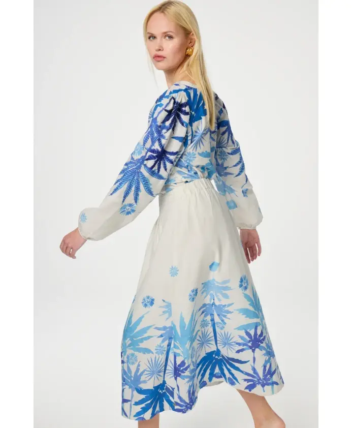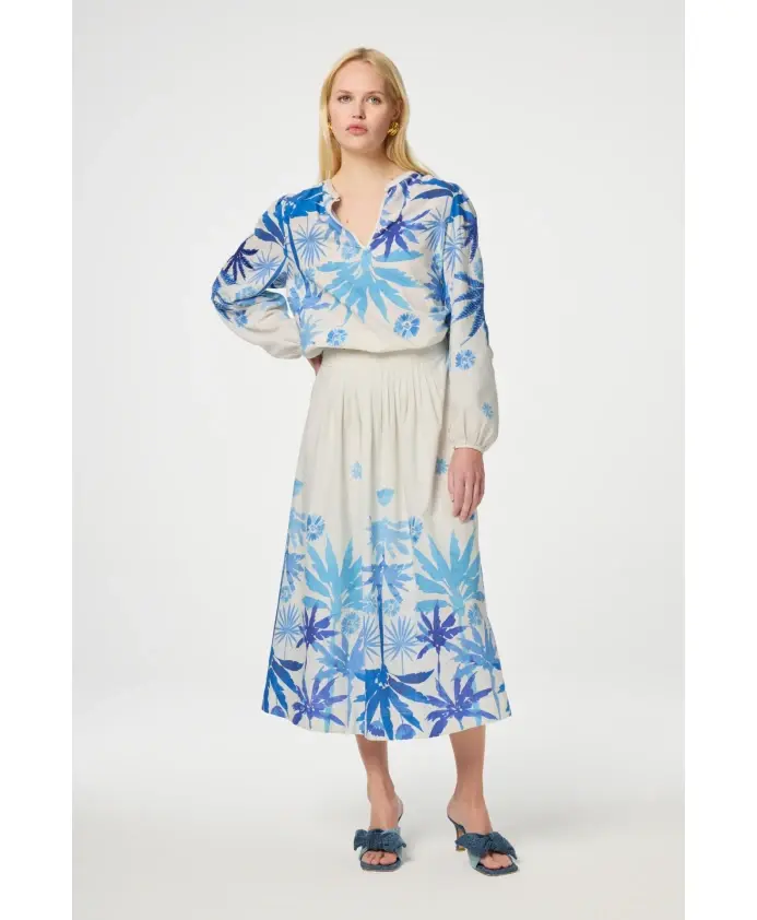 Длинная женская юбка белого цвета с синим принтом станет элегантной деталью любого гардероба и идеально подойдет как для повседневного, так и для шикарного случая. Юбка миди из органического хлопка обеспечивает свободную посадку и комфорт. В сочетании с подходящим топом Carly Top для комплекта из двух предметов из гравия для морской прогулки и майкой Tanja Jersey для завершения образа.