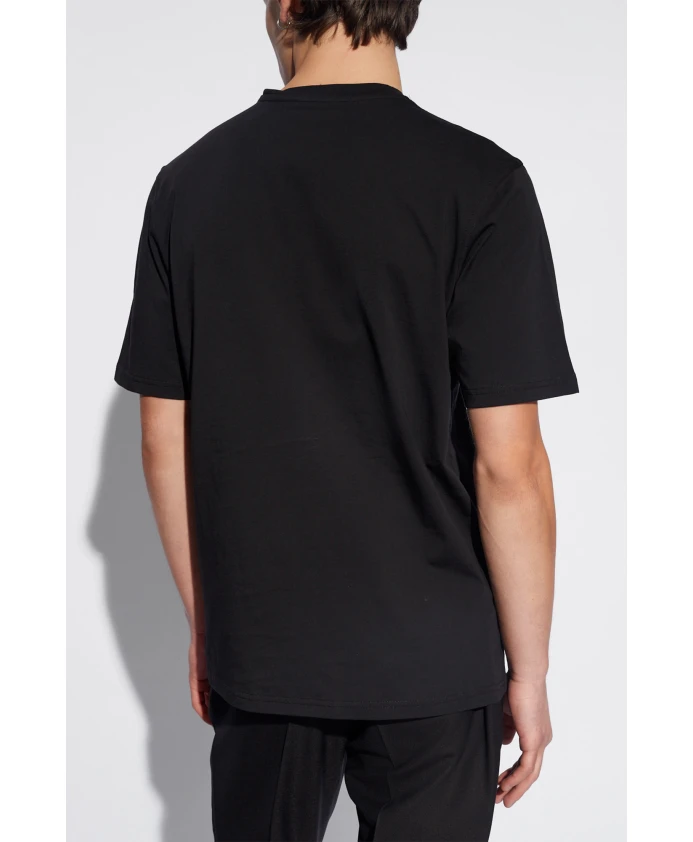 Черная футболка от Moschino. Модель с короткими рукавами, выполненная из хлопка, имеет ребристый круглый вырез и вышитый логотип белого и красного цвета. Размеры модели: Рост: 193 см. Грудь: 95 см. Талия: 82 см. Бедра: 93 см. На модели размер: 50.