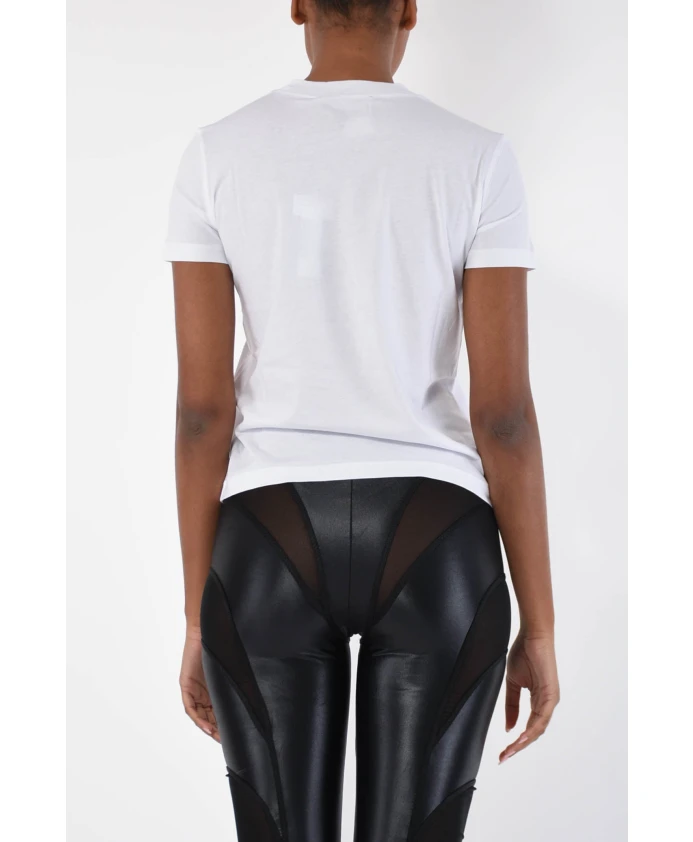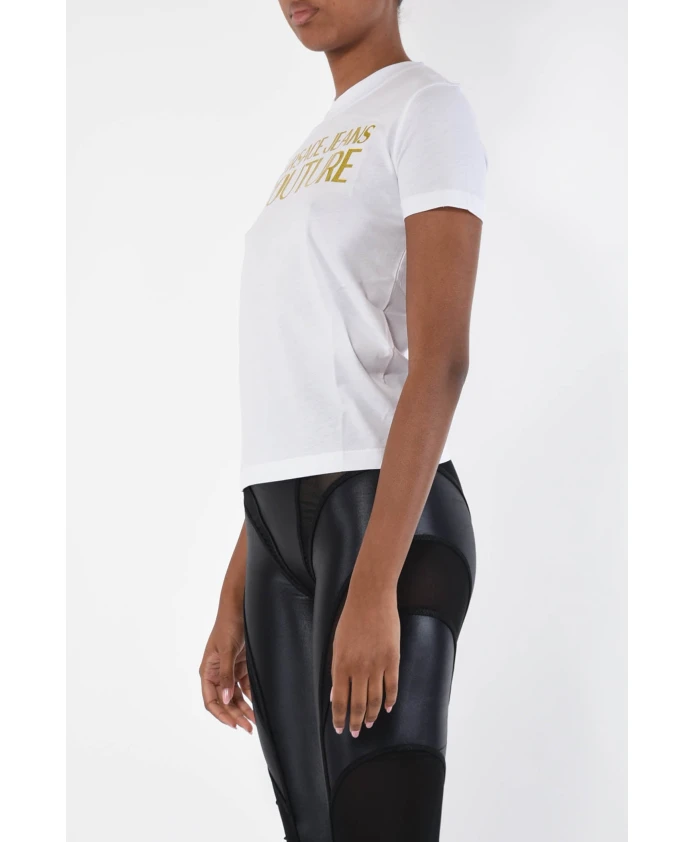 Улучшите свой повседневный гардероб с помощью этой женской футболки Versace Jeans Couture. Эта рубашка из 100 % хлопка с вырезом girocollo и культовым логотипом, напечатанным спереди, произведена в Италии. Рост модели 1,83 см, размер S.