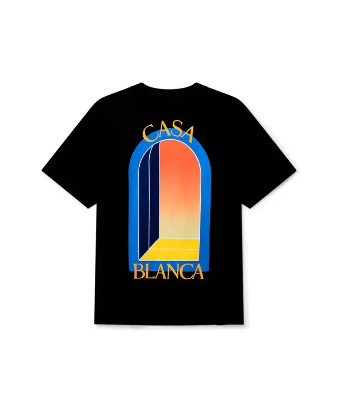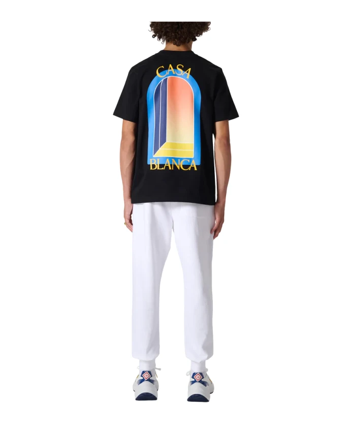 Презентация хлопковой мужской футболки Casablanca Black LArche De Nuit. Эта стильная футболка, изготовленная из 100% органического хлопка, украшена небольшим ярким бантом и принтом с логотипом на левой груди и таким же крупным принтом на спине. У него короткие рукава, круглый вырез, ребристые манжеты и подол. Обновите свой гардероб этой модной и удобной вещью от Casablanca.