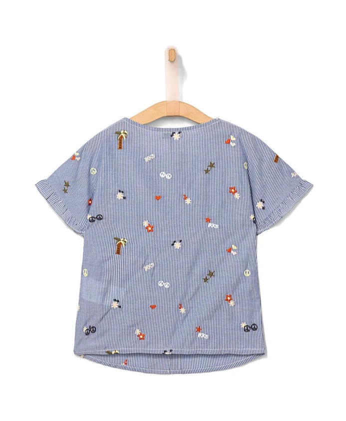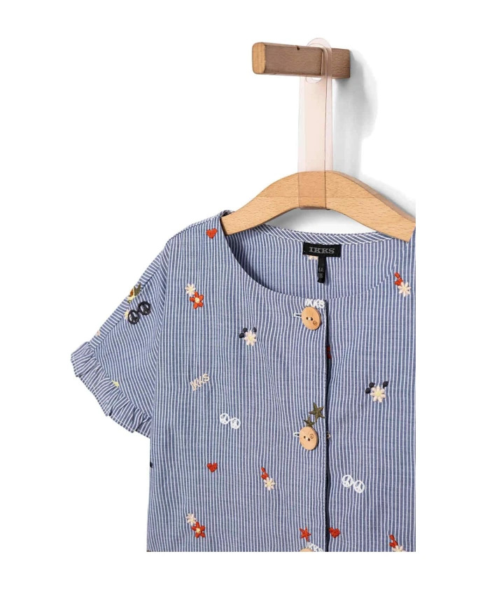 Голубой полосатый топ для девочек IKKS с вышивкой. Темно-синий топ для девочек с белыми полосками и вышивкой IKKS. Круглый вырез горловины, короткие рукава. Белые полосы, рюши на рукавах. Вышитые пальмы, цветы, звезды и солнцезащитные очки. Застежка на деревянные пуговицы. 58% хлопок, 42% полиэстер.