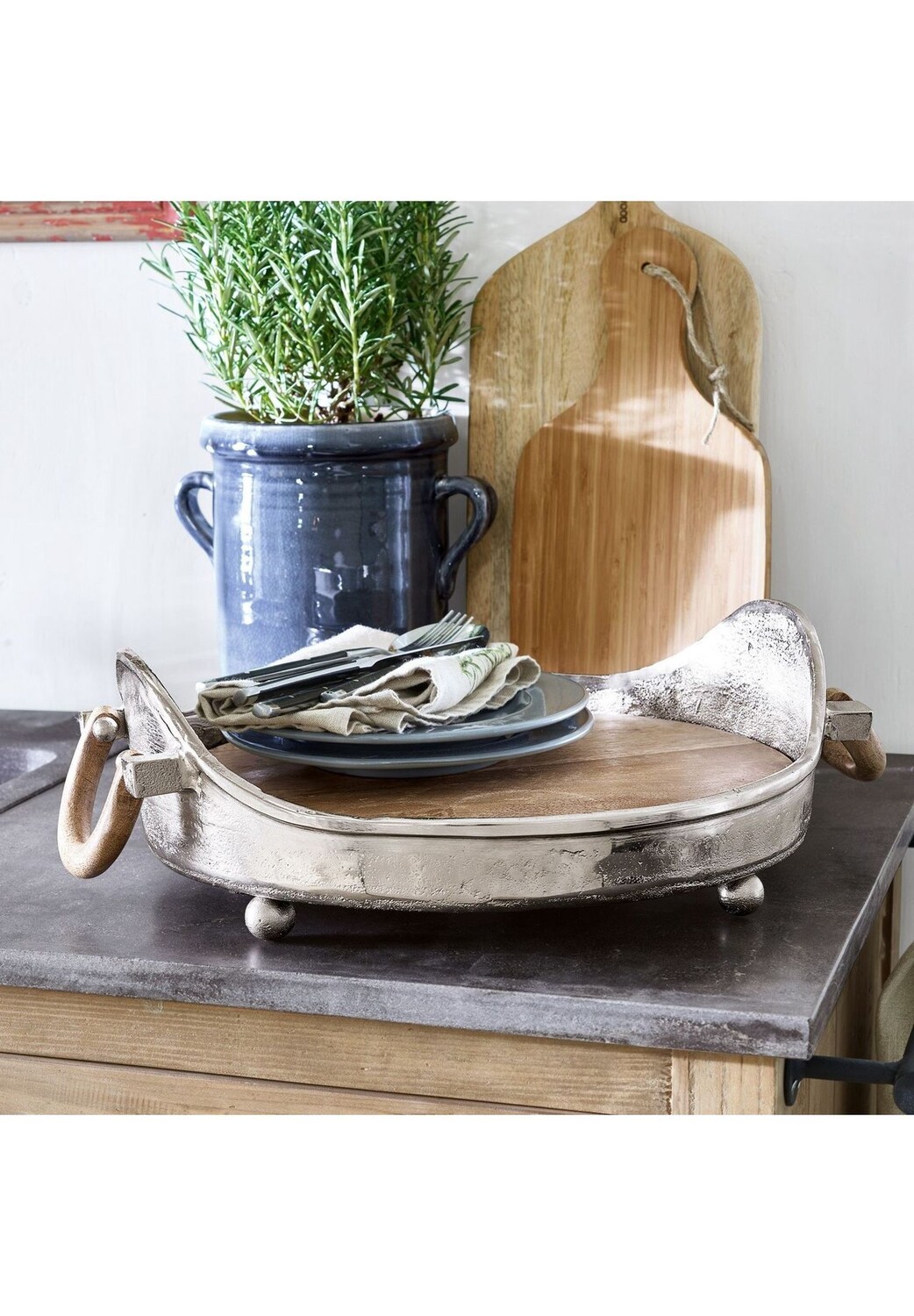 Описание предмета: Элегантный аксессуар из алюминия и дерева манго, выполненный из изысканного сочетания материалов. Это делает сервировку стола по-настоящему увлекательной: очень элегантная модель из никелированного алюминия и ценного дерева манго в изысканном сочетании материалов. Будь то неторопливый завтрак на выходных, чай или кофе с пирожными с друзьями, изысканный обед или ужин: вы можете безопасно и стильно доставить свои деликатесы к столу. Вы даже можете сразу подать деликатесы к столу. Потому что элегантный вид облагораживает любой стол. Благодаря боковым ручкам его очень легко переносить. Роскошная модель также является идеальной основой для чисто декоративных эффектов. Расставьте на нем фонари, ароматические свечи и свежие цветы и создайте стильный центральный элемент вашего стола в гостиной.