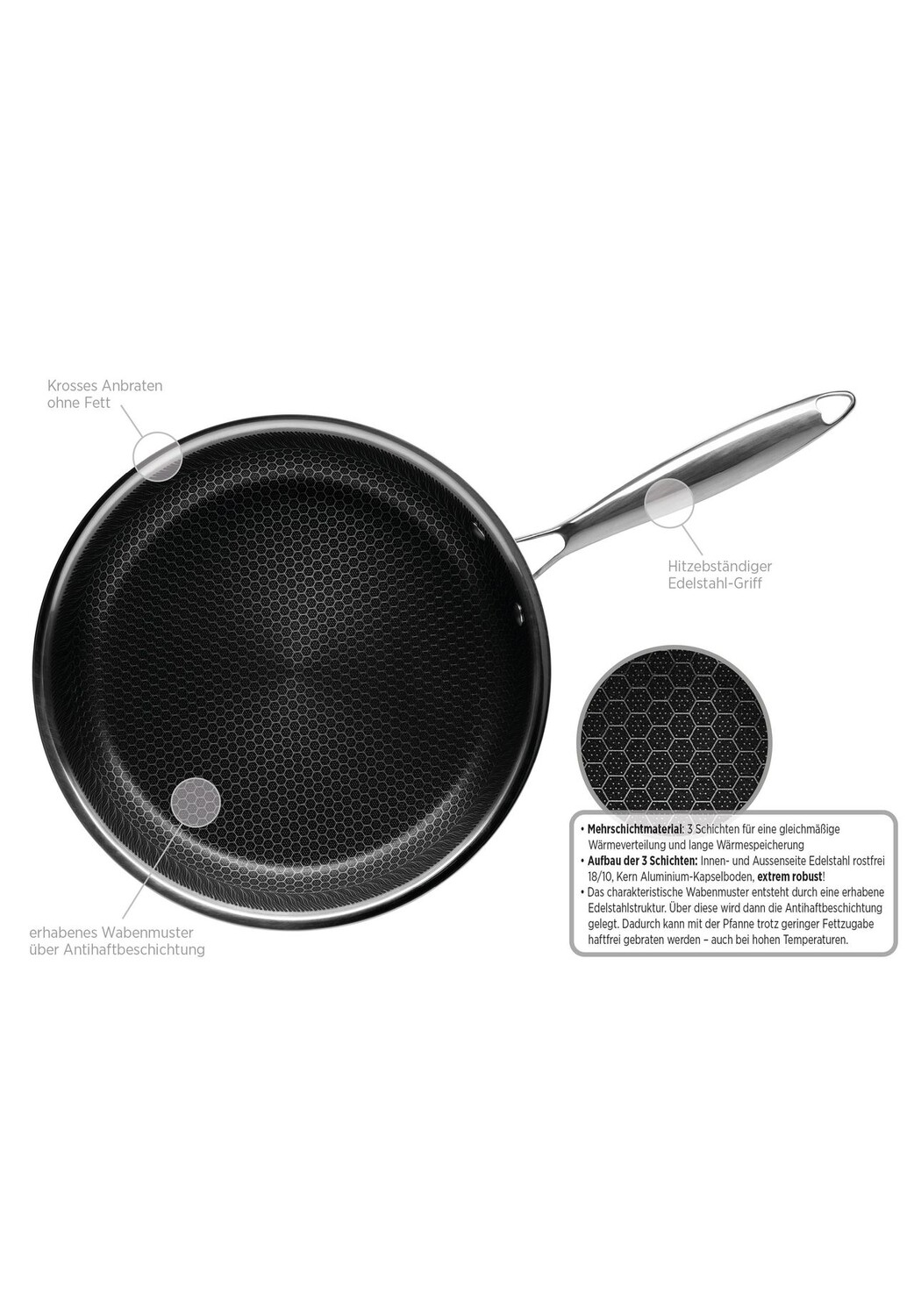 Описание продукта: Здоровое и нежирное обжаривание без ущерба для восхитительного хрустящего вкуса жареного мяса — теперь с серией Hestia это стало очень просто. Серия сковород из нержавеющей стали от традиционного австрийского бренда Mäser отвечает ожиданиям всех тех поваров-любителей, которые хотят поджаривать мясо и овощи, чтобы ничего не прилипло. Поверх антипригарного покрытия сковородок помещена специальная сотовая конструкция из нержавеющей стали, которая также определяет внешний вид. Сочетание обоих слоев позволяет обжаривать с небольшим количеством жира и в то же время предотвращает прилипание мяса или других жареных продуктов. Сковороды и вок из нержавеющей стали подходят для электрических, газовых и индукционных плит. Для легкой чистки мы рекомендуем мягкую губку и немного жидкости для мытья посуды.