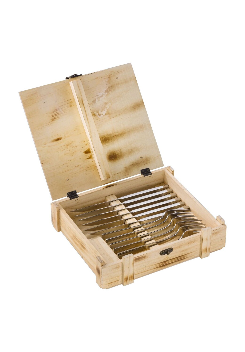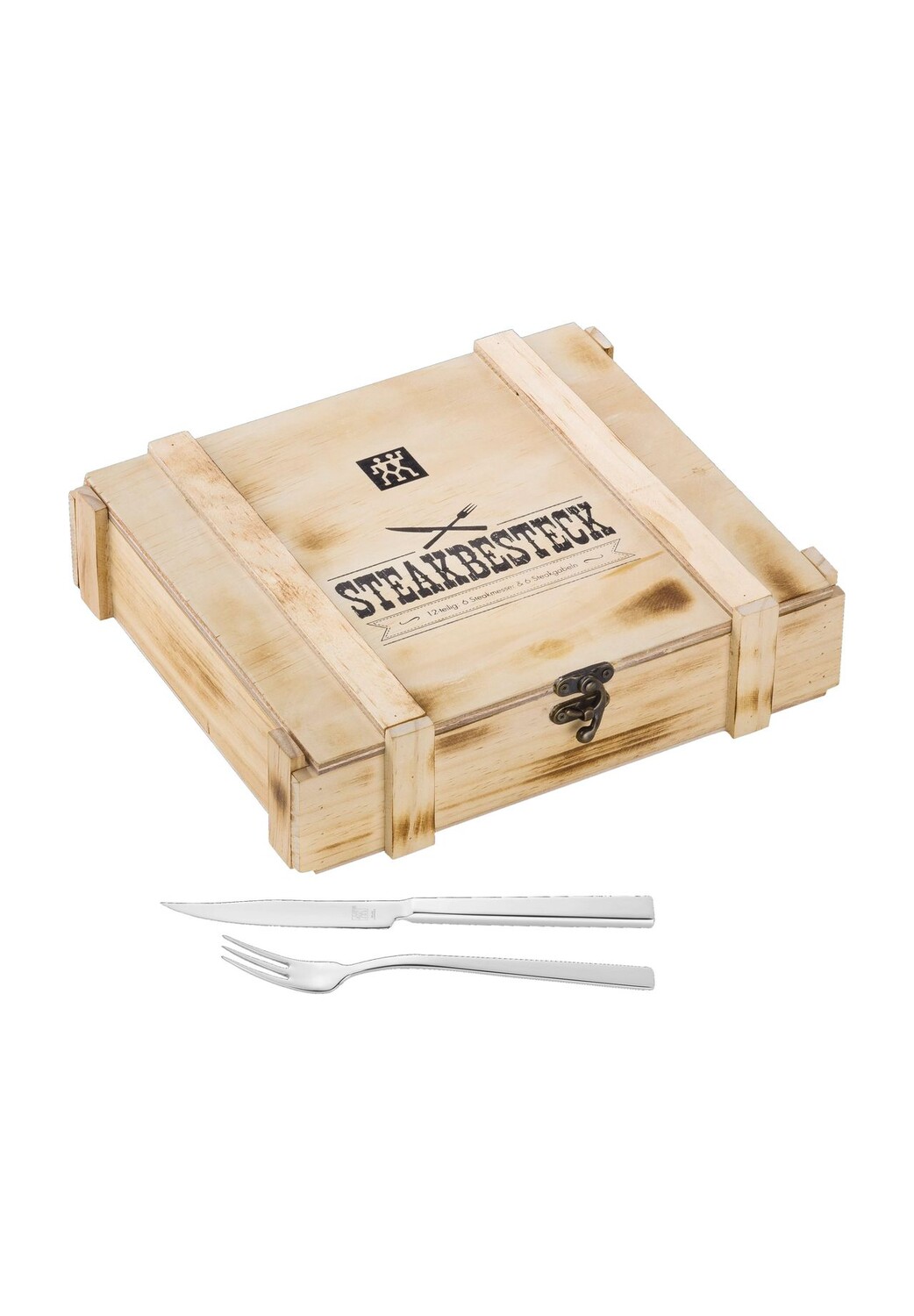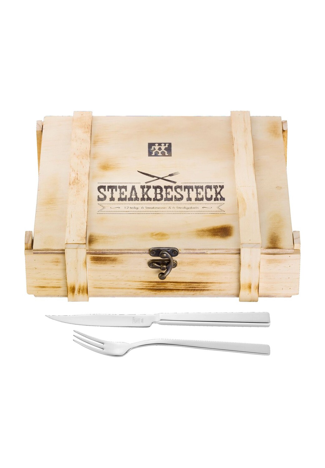Объём поставки: 6 вилки для стейка, 6 ножей для стейка, 1 деревянная коробка
