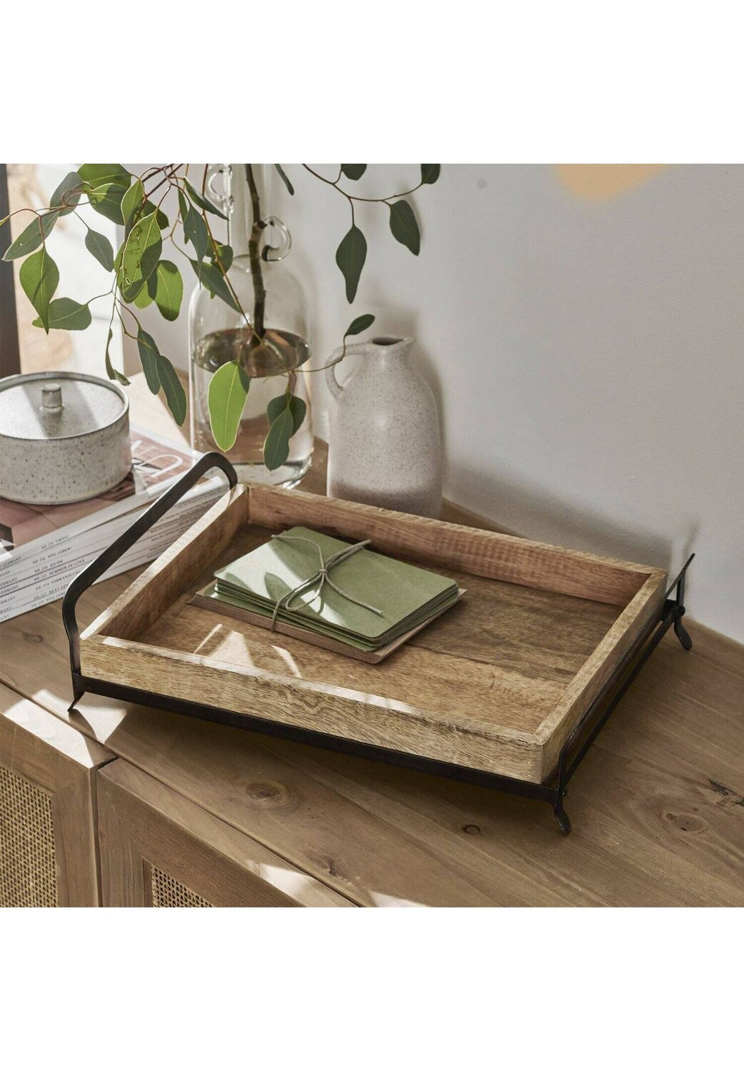 Описание предмета: Натуральное дерево манго с красивой текстурой. Стильно изогнутая железная рама. Преподносит украшения, перевозит посуду или служит полкой для бумаг в офисе. Этот элегантный поднос можно использовать по-разному – для подачи завтрака, для кофе в постель, как основу для декоративных композиций или как офисную полку – здесь найдется место для множества вещей. Вечный аксессуар отличается высоким качеством и стабильностью, поэтому вы сможете наслаждаться им долгое время. Это эстетическое дополнение ко многим стилям дома. При необходимости деревянный поднос можно снять с держателя утюга, что делает обращение с ним еще проще и удобнее.