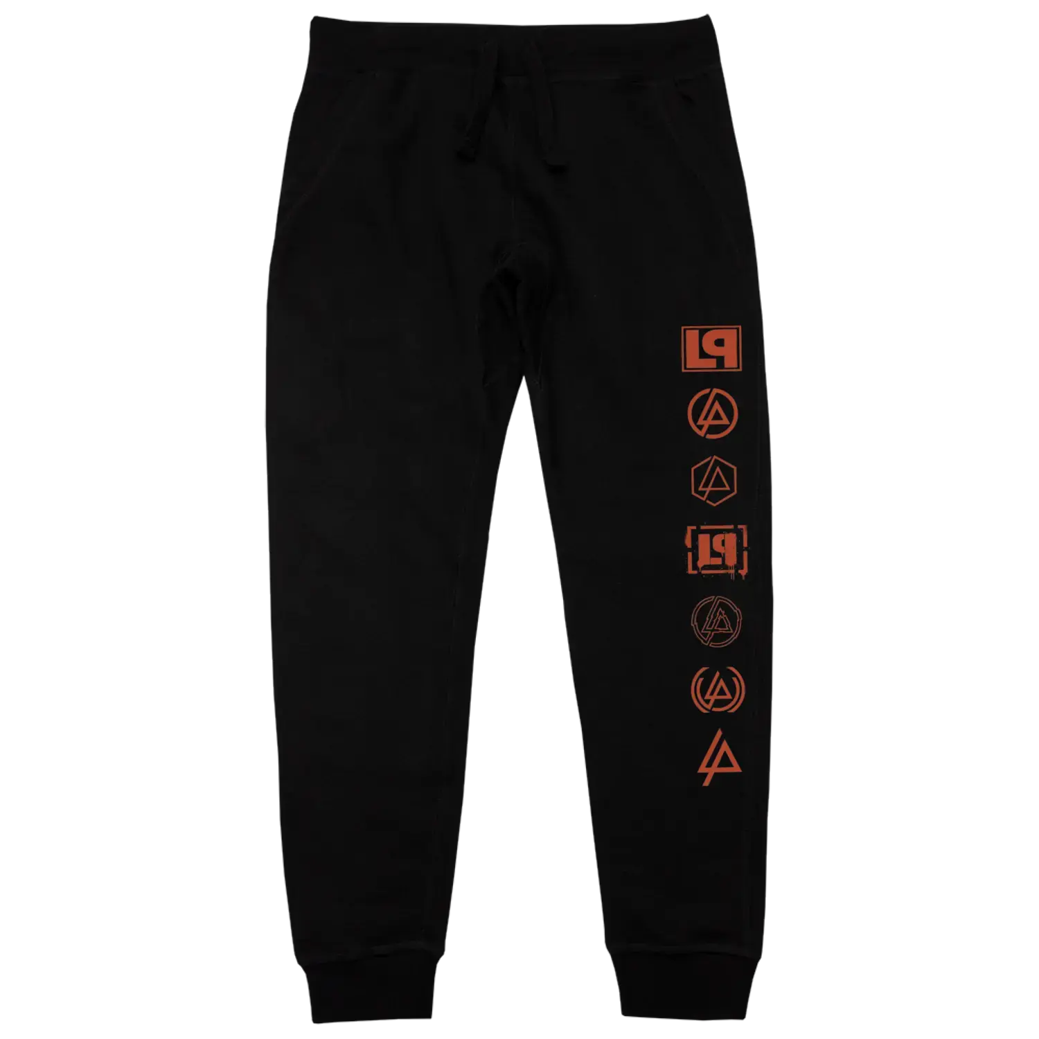 Черные флисовые джоггеры с серией красных логотипов LP на левой штанине. Джоггеры с двумя боковыми и одним задним карманами, ребристыми манжетами внизу и поясом с утягивающим шнурком. Вставка в промежности для удобства.
