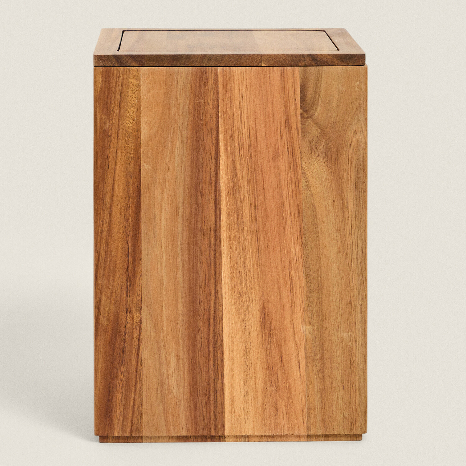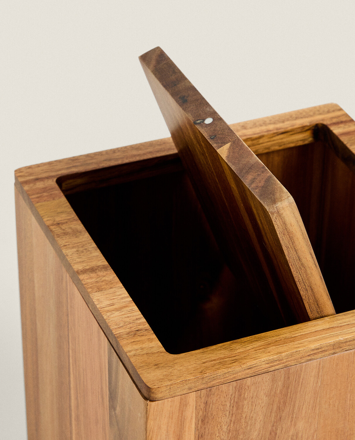 Большая деревянная корзина для мусора в ванной комнате с квадратным основанием.