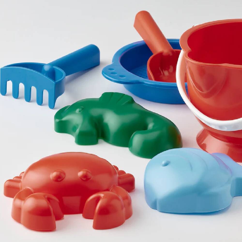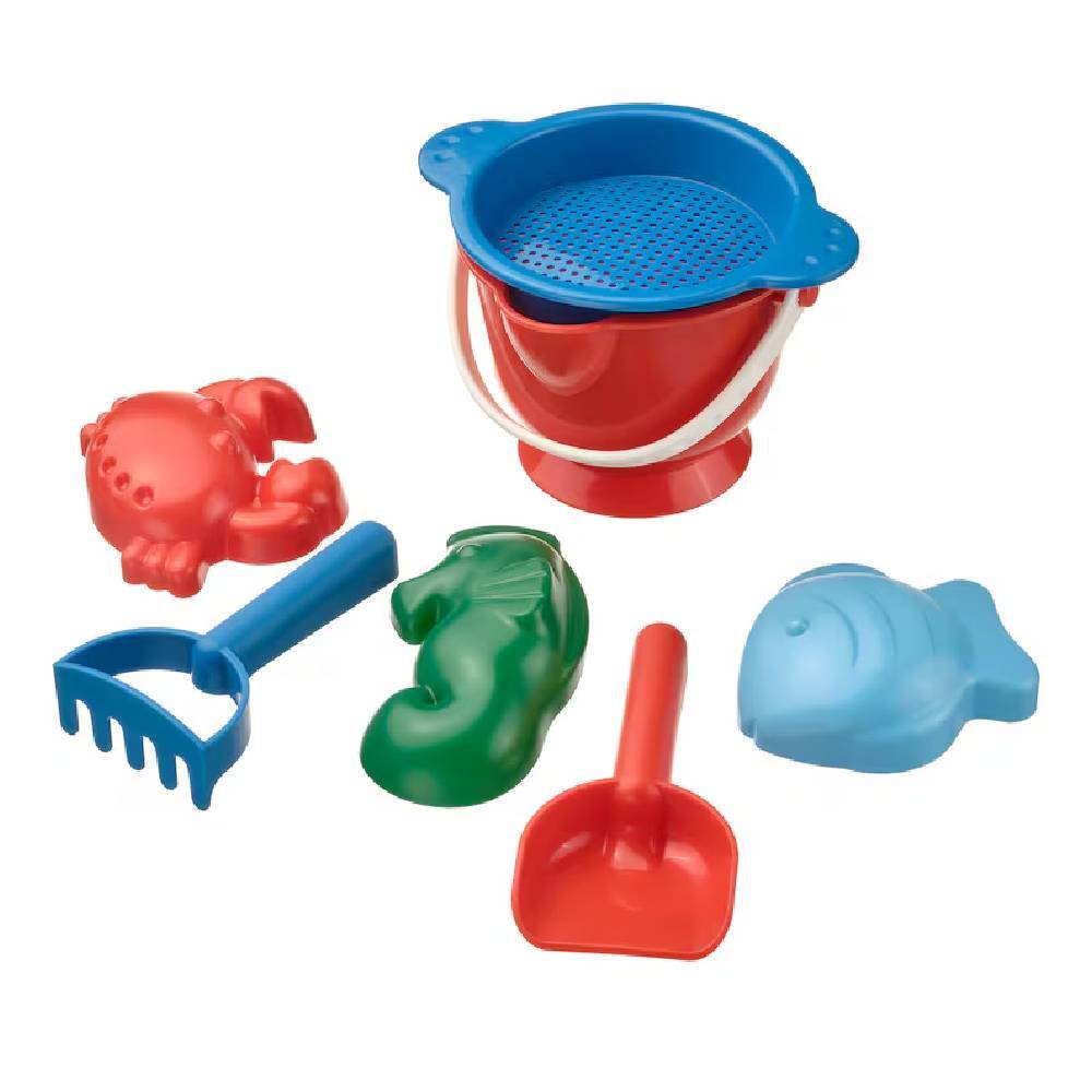 В комплекте: 1 сито, 1 ведро, 1 грабли, 1 лопата и 3 формы для песка.