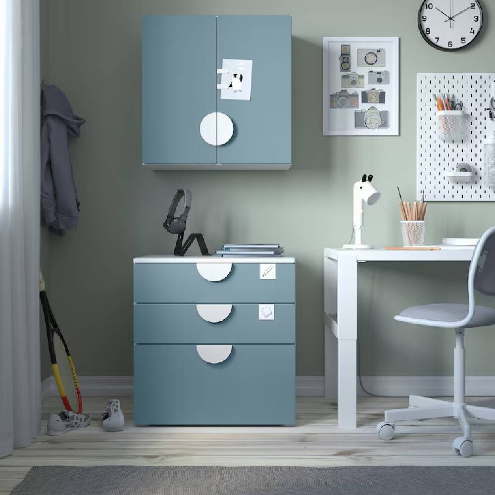 Игрушки, книги и незавершенные поделки можно убрать в шкаф подальше от глаз.