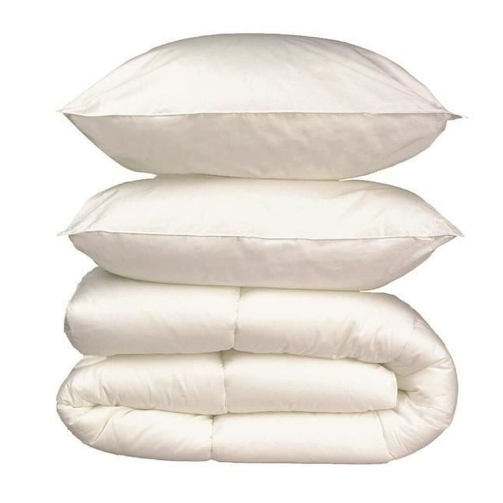 Комплект постельного белья состоит из: 1 пухового одеяла 220x240 см + 2 подушки 60х60см. Чехол: микрофибра 72 г/м². Наполнитель: 100% полый силиконизированный полиэстер – легкое и сверхвысокое волокно. Пуховое одеяло: 400 г/м² Тонкие швы, косая обработка из поликоттона. Подушка: 500 г/м², с эффектом сатина. В упаковке + НЕЙТРАЛЬНЫЙ вкладыш. Сделано во Франции.