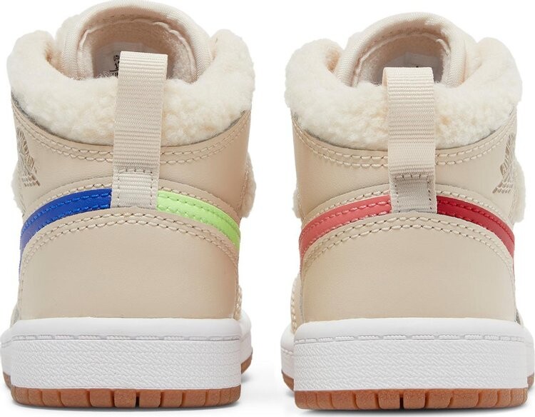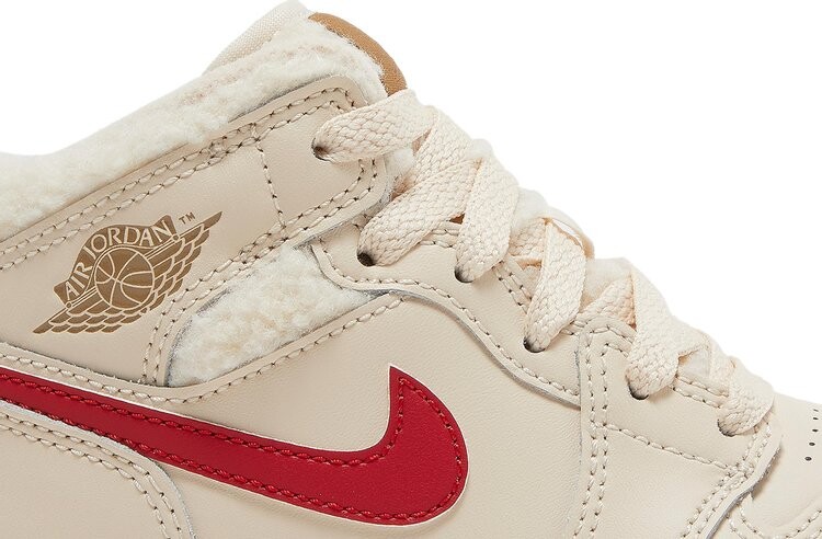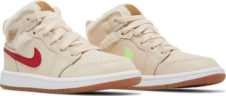 Кроссовки Air Jordan 1 Mid Utility PS «Fleece», предлагаемые в размерах для маленьких детей, придают классическому силуэту уютный вид. Верх выполнен из кожи жемчужно-белого цвета с петлей для подтягивания на пятке и мягкой флисовой конструкцией на воротнике и язычке. Контрастные цветовые акценты появляются благодаря несовпадающим логотипам-галочкам на каждой обуви. Средняя часть верха опирается на белую резиновую межподошву с герметизированной вставкой Air-sole в пятке. Резиновая подошва под ногами обеспечивает цепкое сцепление.