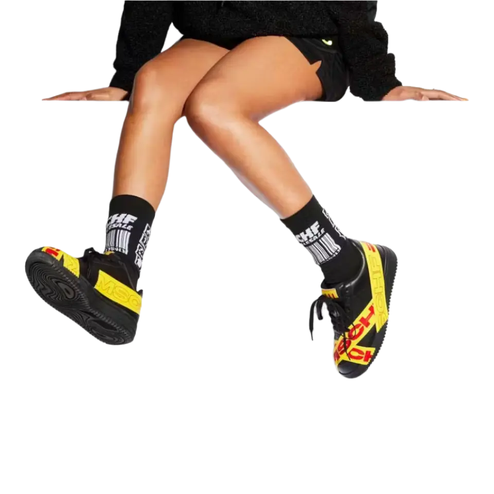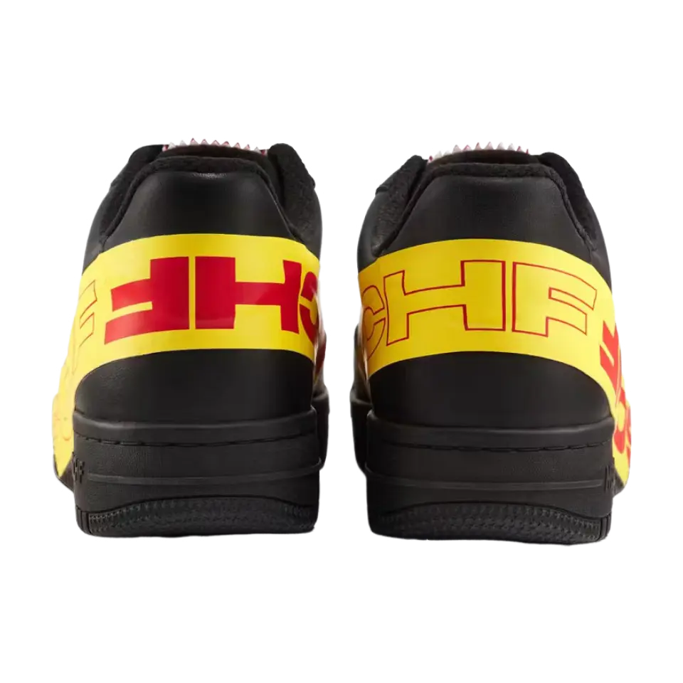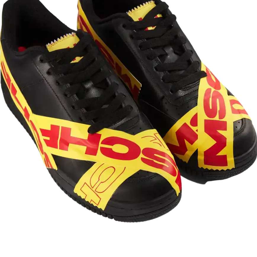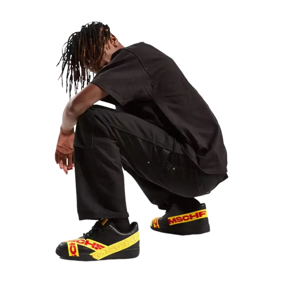MSCHF TAP3 'Black' - это продолжение нашумевшей модели Air Max 97 «Satan Shoes» от бруклинского коллектива, коллаборации 2021 года с Lil Nas X, которая вызвала немало споров. В отличие от прошлых релизов лейбла, эта модель - оригинальное творение, подчеркнутое знакомой формой лоу-топа классического баскетбольного силуэта. Верхняя часть выполнена из черной кожи и украшена термосвариваемой лентой TPU ярко-желтого цвета. Красные полосы с брендингом MSCHF опоясывают носочную и пяточную части и переходят в черную резиновую подошву.