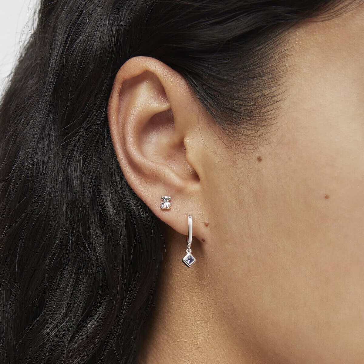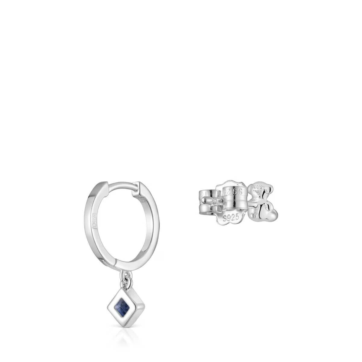 Комплект из стерлингового серебра - серьга-гвоздик с рисунком медведя и серьга-кольцо с подвеской с ограненным квадратным иолитом. Размер драгоценного камня: 2,5 мм. Размер обруча: 10 мм. Размер орнамента: 5 мм.