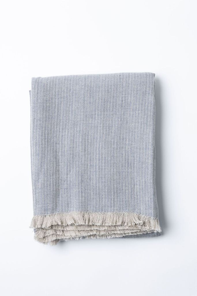 Двусторонний плед из 100% льна с бахромой, синего цвета. 165х210см. Классический льняной плед синего цвета «елочка» — чрезвычайно универсальное изделие, которое можно использовать круглый год. Его можно использовать как покрывало или плед для пикника. -Ткань проходит специальную технологию стирки, что делает ее исключительно мягкой и нежной. - с бахромой по коротким краям - После стирки оно больше не садится, не теряет цвет и форму и не растягивается в будущем. - Поддерживает одинаковую температуру тела, подходит для всех сезонов - Прочный и прочный - даже в 3 раза прочнее и в 5 раз более устойчив к истиранию, чем хлопок. 100% лен, ширина 160±5 см, 288±28 г/м2.