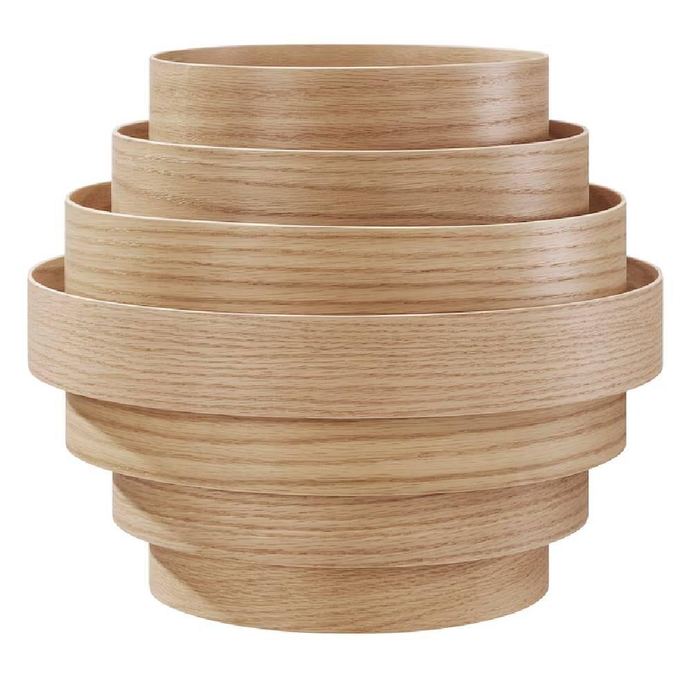 В этом варианте абажура семь колец вместо прежних девяти. Крайний слой шпона по-прежнему представляет собой лакированный дуб, но теперь к нему соединили березу и бук.