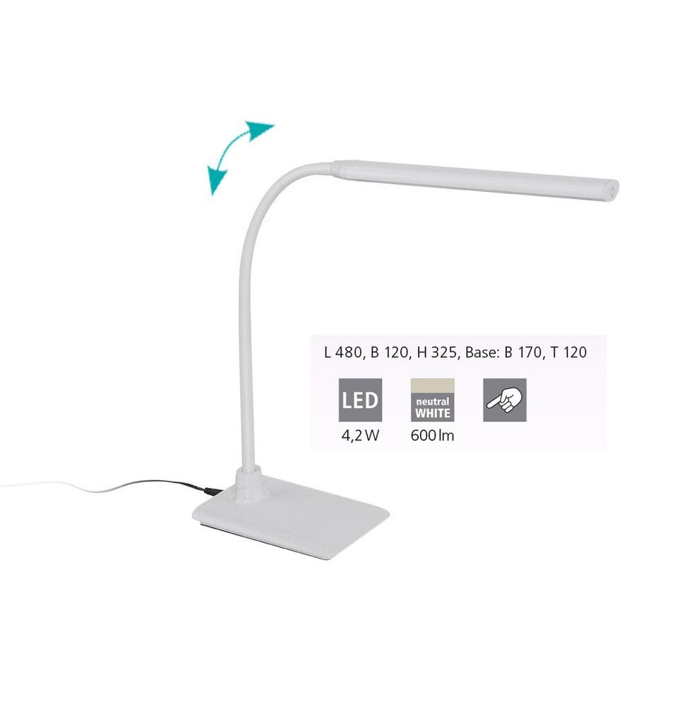 Цвет: белый, материал: пластик, цоколь: плата светодиода, ширина: 120 мм, высота: 325 мм, длина: 480 мм, мощность: 4,5 Вт, светлый цвет Цвет: нейтральный белый, люмен: 550 лм, лампа в комплекте: ДА, дополнительная информация: диммер вкл. , сенсорный диммер, с кабелем + вилкой европейского стандарта, тип продукта: светильники Eglo, светодиодные настольные лампы, светодиодные настольные лампы, офисные светильники