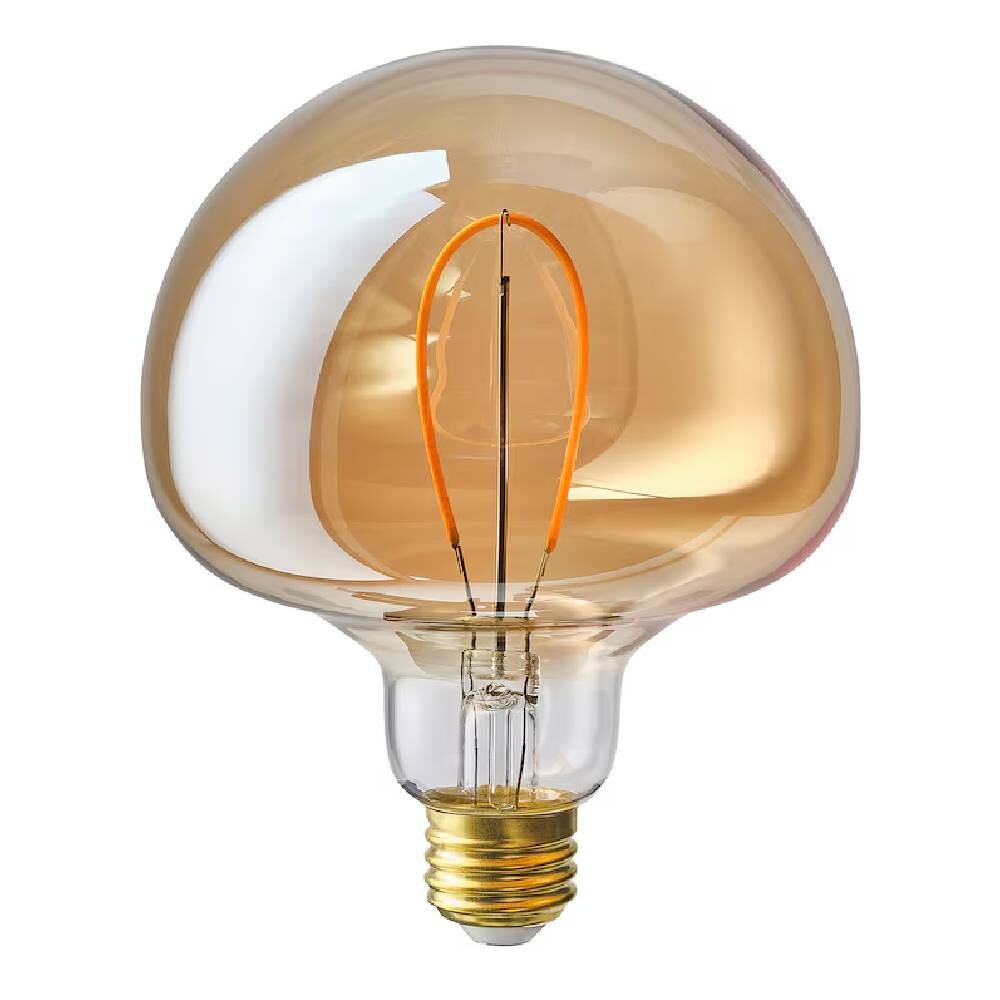 Светодиодная лампа в форме колокола из коричневого стекла имеет нить накаливания, соответствующую цвету стекла. Красивая лампа освещает комнату теплым светом.