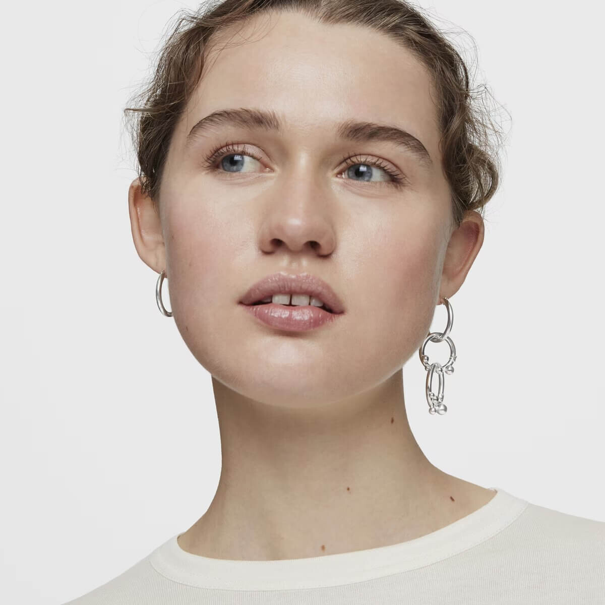 Короткая и длинная серебряные серьги-кольца с деталями.