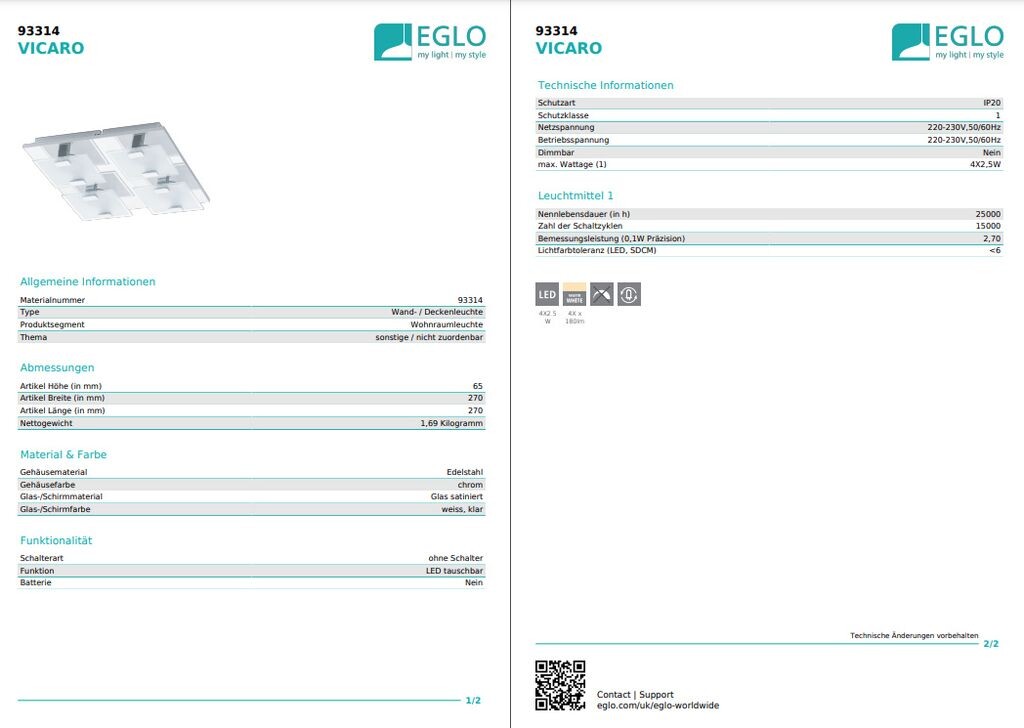 Светодиодный потолочный светильник Общая информация Номер материала 93314 Настенный/потолочный светильник Продукт сегмент Светильник для гостиной Тема другая / не может быть назначена Размеры Высота изделия (в мм) 65 Ширина изделия (в мм) 270 Длина изделия (в мм) 270 Вес нетто 1,69 кг Материал и цвет Материал корпуса нержавеющая сталь Цвет корпуса хром Материал стекла/абажура Сатиновое стекло Цвет стекла/абажура белый, прозрачный Функциональность Тип переключателя без переключателя Функция Сменный светодиод Батарея Нет Техническая информация Класс защиты IP20 Класс защиты 1 Сетевое напряжение 220-230 В, 50/60 Гц Рабочее напряжение 220-230 В, 50/60 Гц С возможностью регулирования яркости Нет макс. Мощность (1) Лампа 4X2, 5 Вт 1 Номинальный срок службы (в ч) 25 000 Число циклов переключения 15 000 Номинальная мощность (точность 0, 1 Вт) 2, 70 Допуск на цвет света (LED, SDCM)