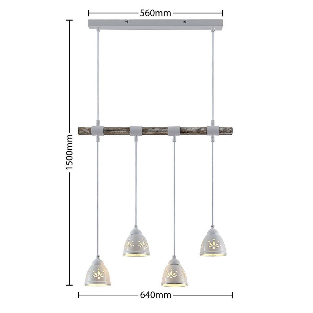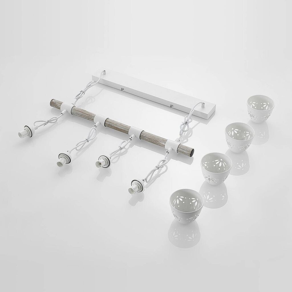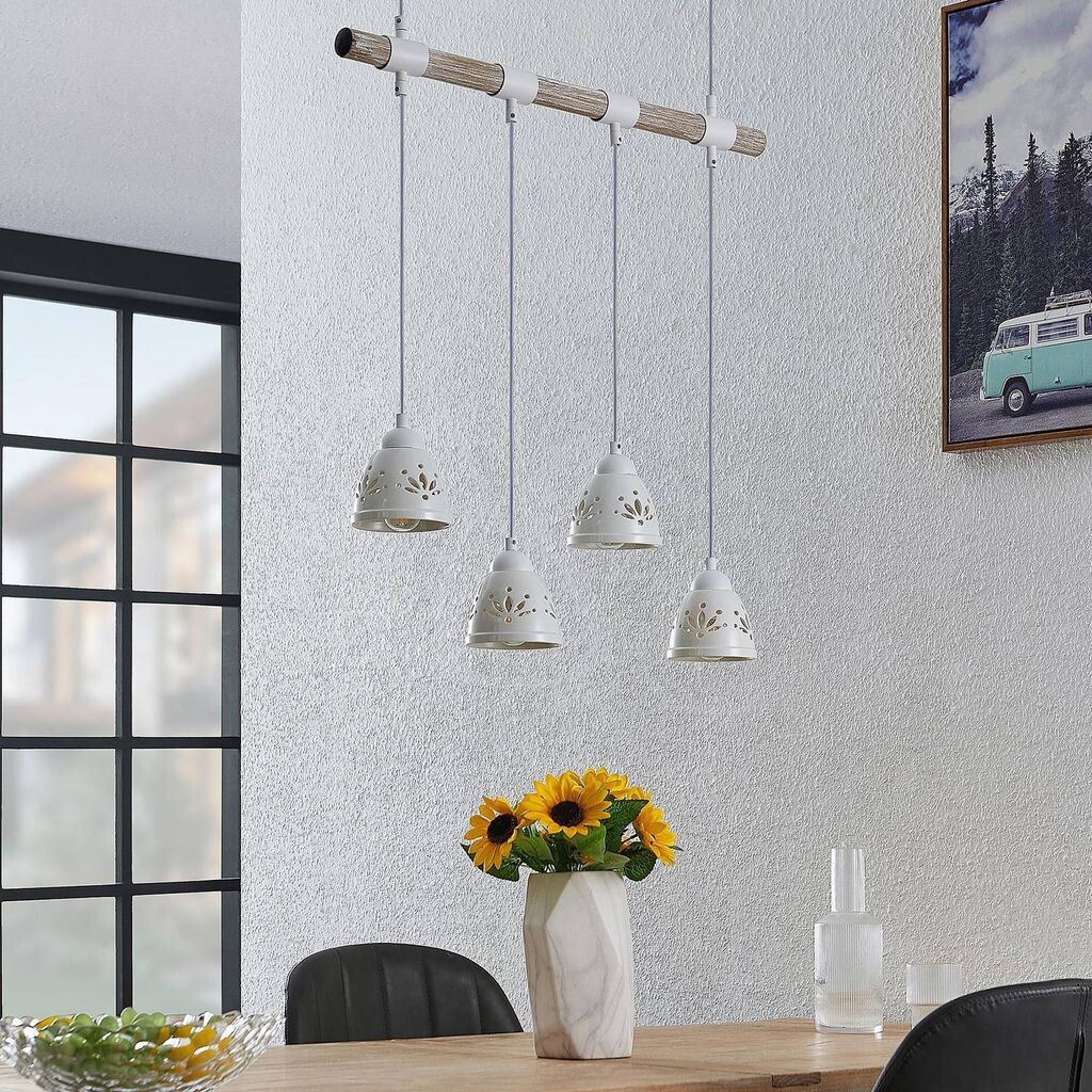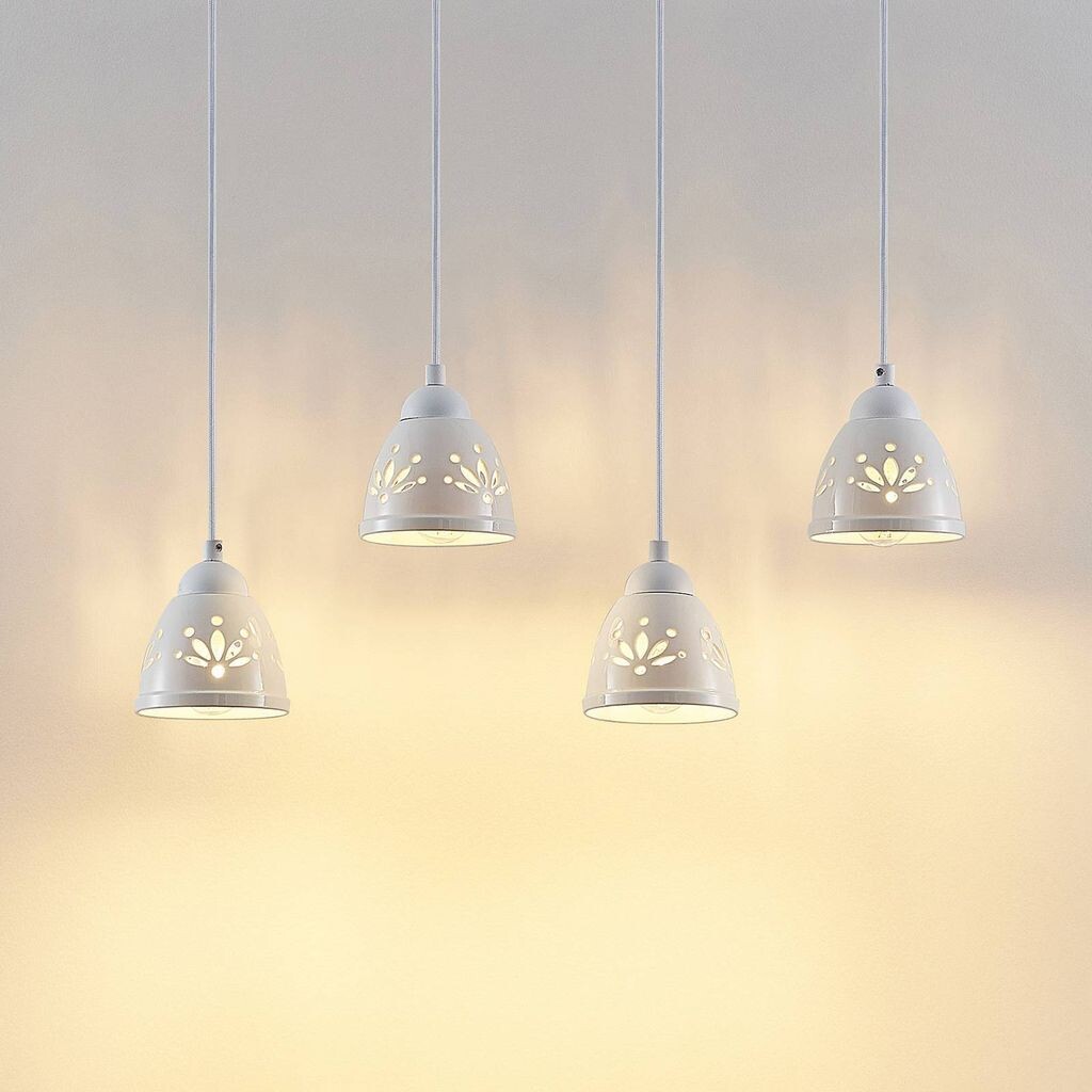 Подвесной светильник Pimana изготовлен из стали и впечатляет красиво декорированными керамическими абажурами. Он особенно эффектен над обеденным столом или над стойкой.