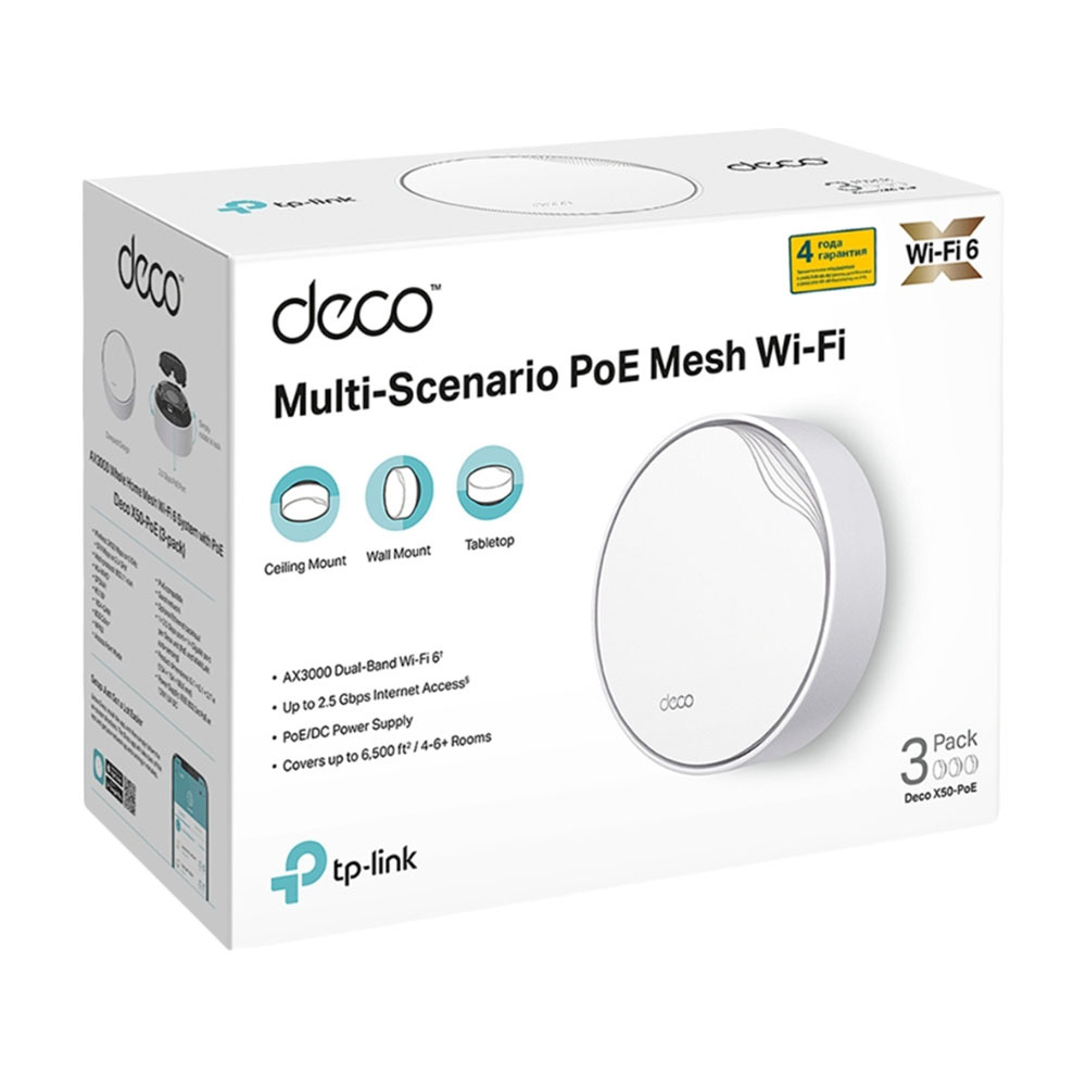 Благодаря поддержке PoE устройство Deco X50-PoE способно получать питание и обмениваться данными по одному кабелю Ethernet. Также возможно стандартное подключение к электросети (адаптер питания идёт в комплекте).