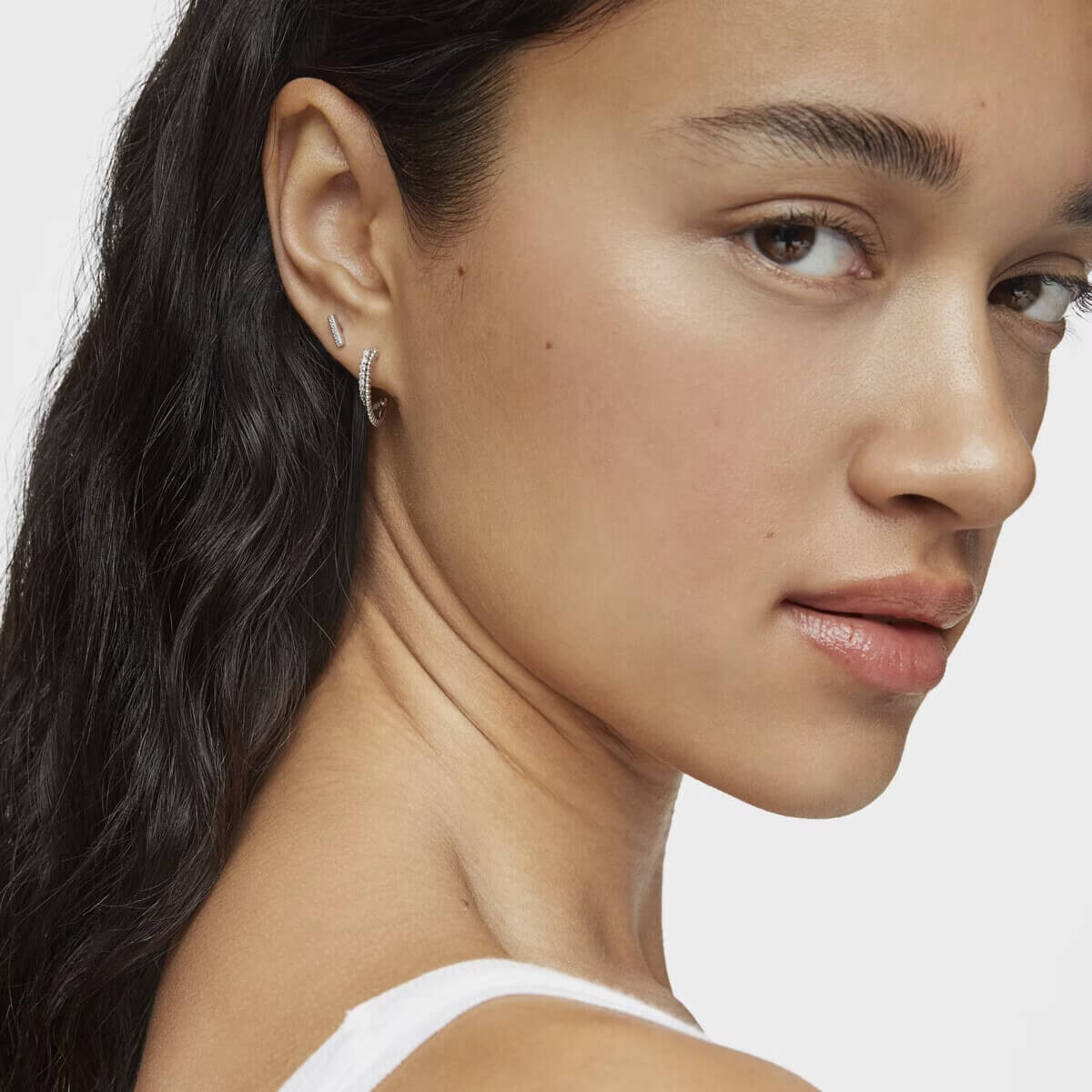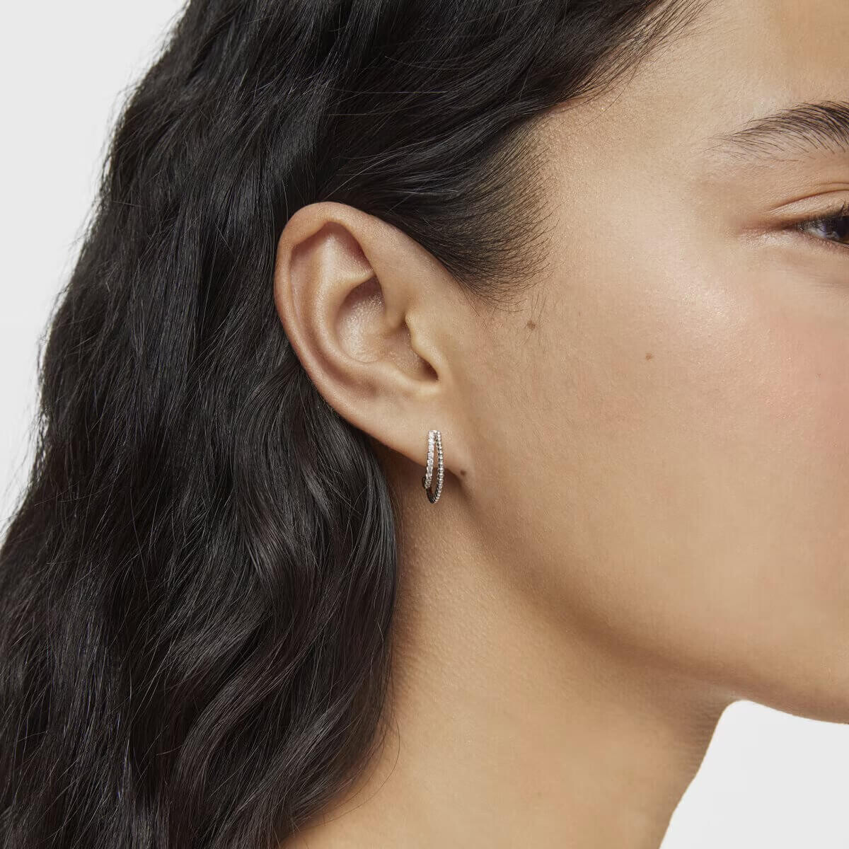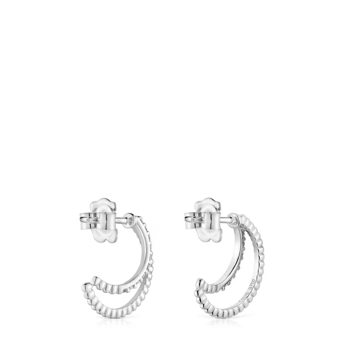 Короткие серьги с двойным обручем из 18-каратного белого золота с бриллиантами бриллиантовой огранки 0,18 карата. Качество бриллиантов: H/SI.