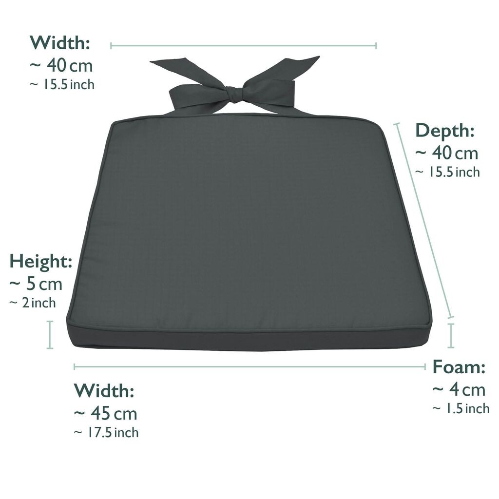 Комплект подушек для сидения состоит из четырех подушек размером 45 х 40 х 5 см со встроенными ремнями для крепления. Их ширина 45 см спереди и 40 см сзади, по направлению к спинке.