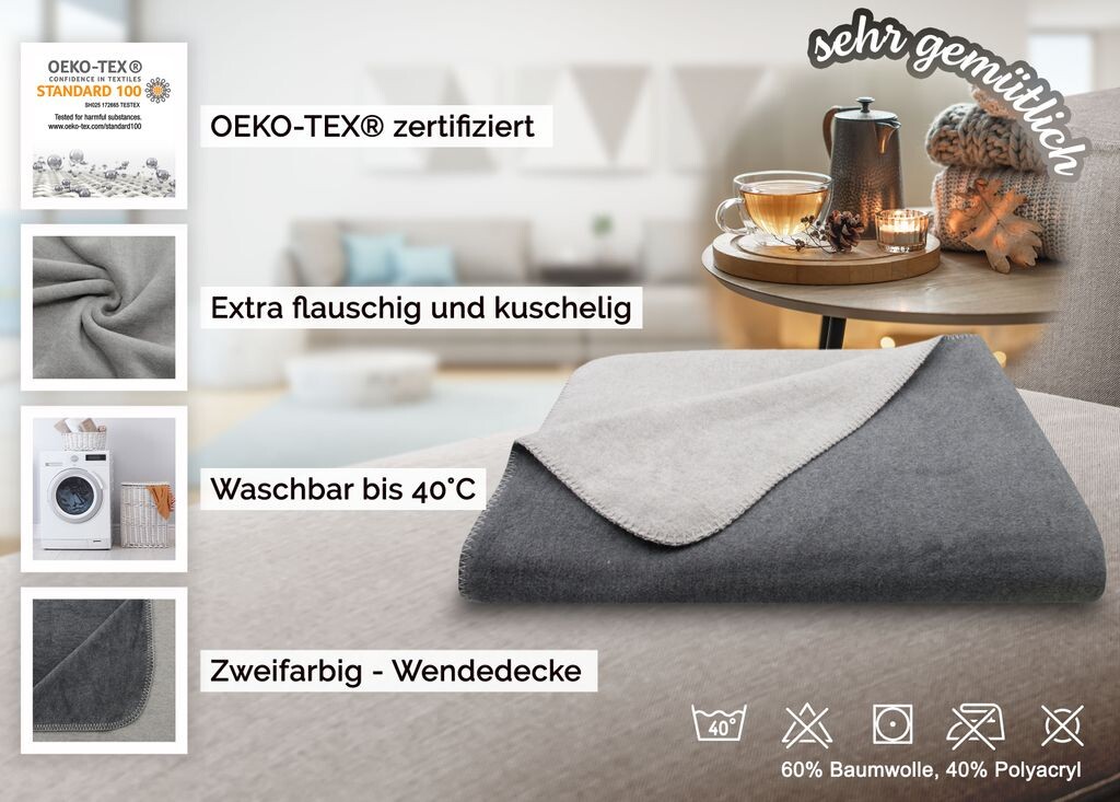 Мягкое одеяло изготовлено из 60 % хлопка и 40 % полиакрила и имеет элегантный край. Благодаря этому одеяло становится приятно теплым и пушистым. Изготовлен в удобном размере 150х200 см. С помощью этого двустороннего одеяла в двух цветах вы сможете создать уютные акценты в своем доме. Большой выбор цветов предлагает различные варианты и может использоваться в самых разных помещениях.