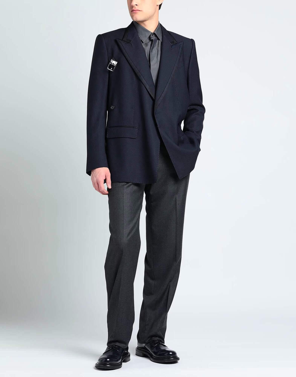 Оригинальный темно-синий пиджак, украшенный пряжкой, застегивающийся на одну пуговицу.
