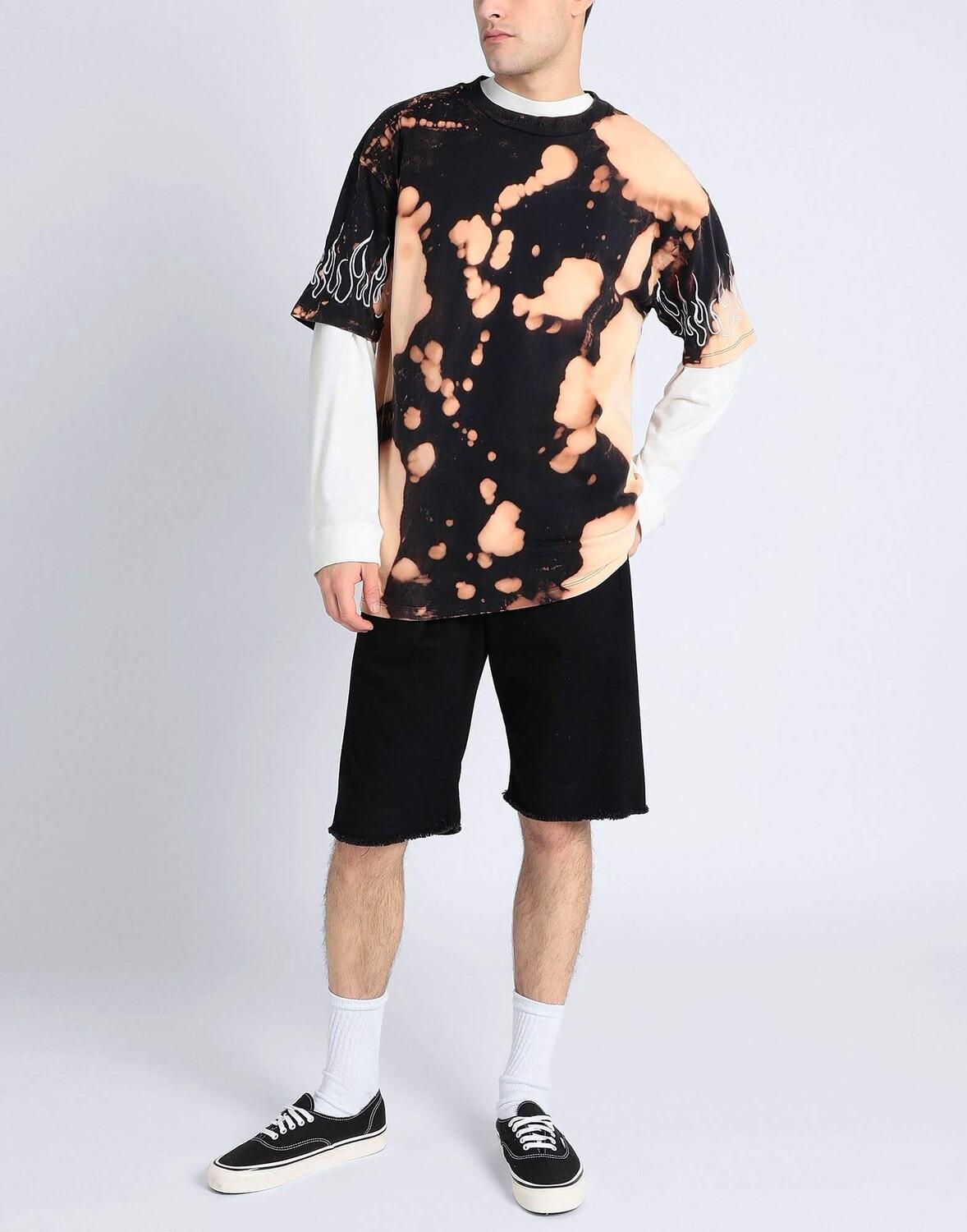 Джерси, эффект пятен, вышивка, логотип бренда, разноцветный узор, круглый вырез горловины, короткие рукава.
