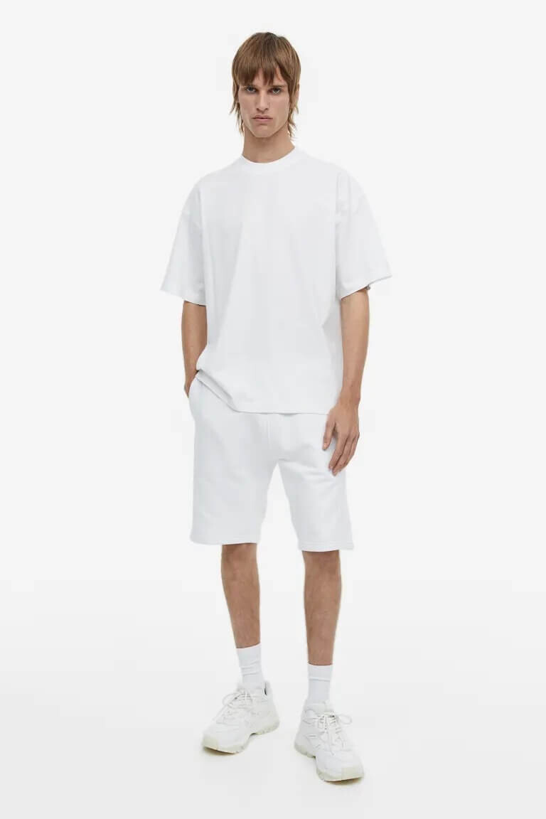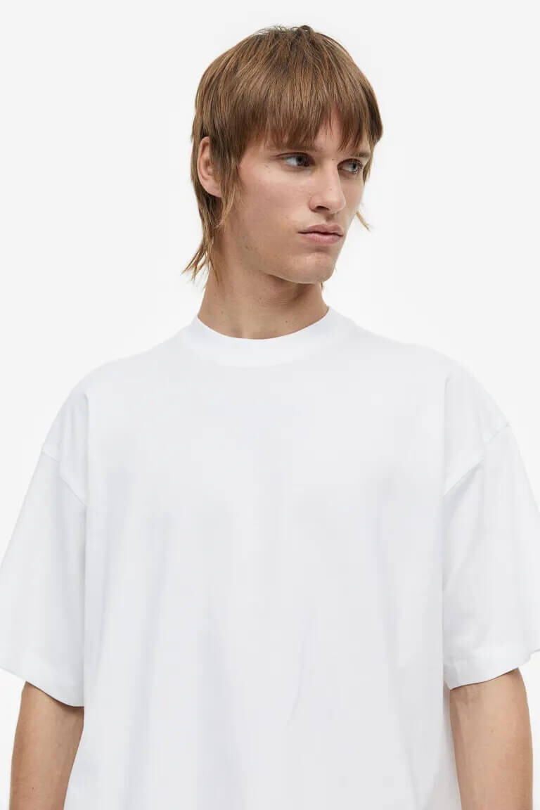 Футболка оверсайз из мягкого хлопкового трикотажа с круглым вырезом в рубчик, заниженными плечами и прямым низом.