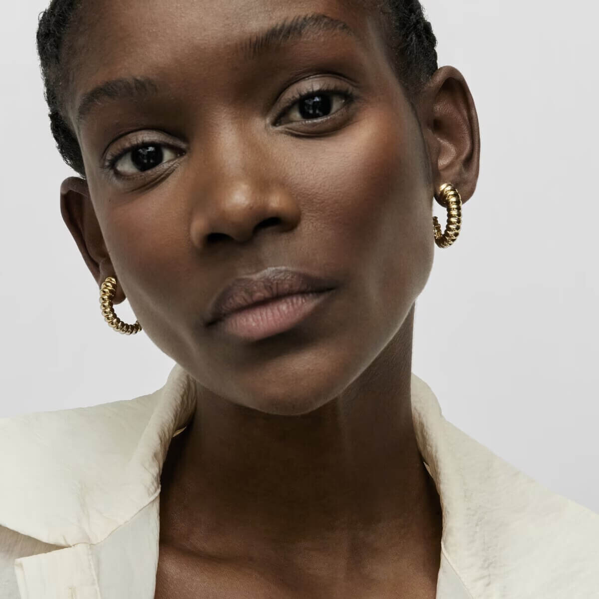 Серьги-кольца из позолоченного серебра, имитирующие структуру гусеницы. Диаметр: 15 мм.