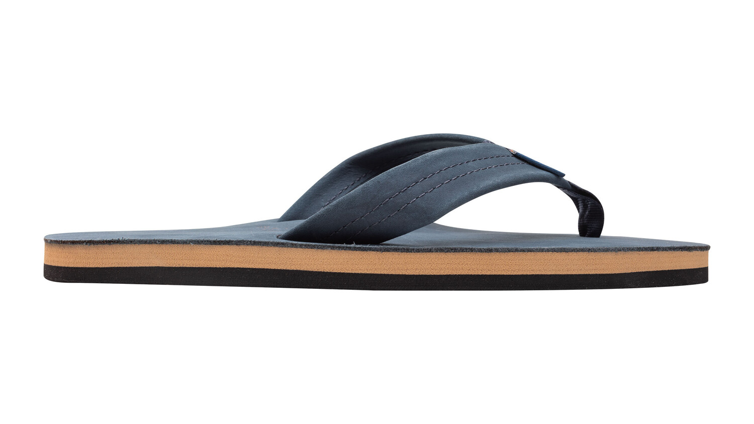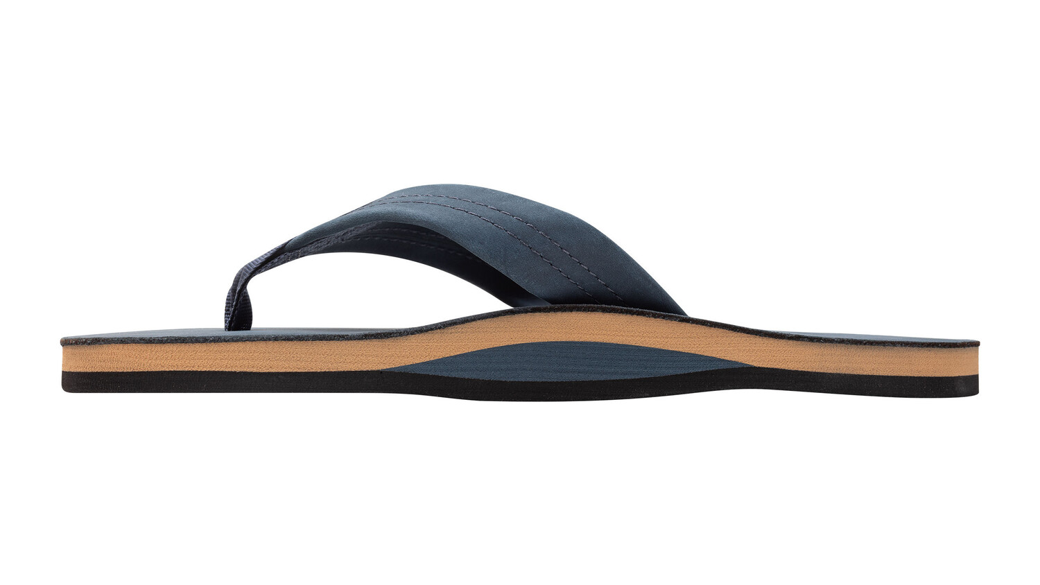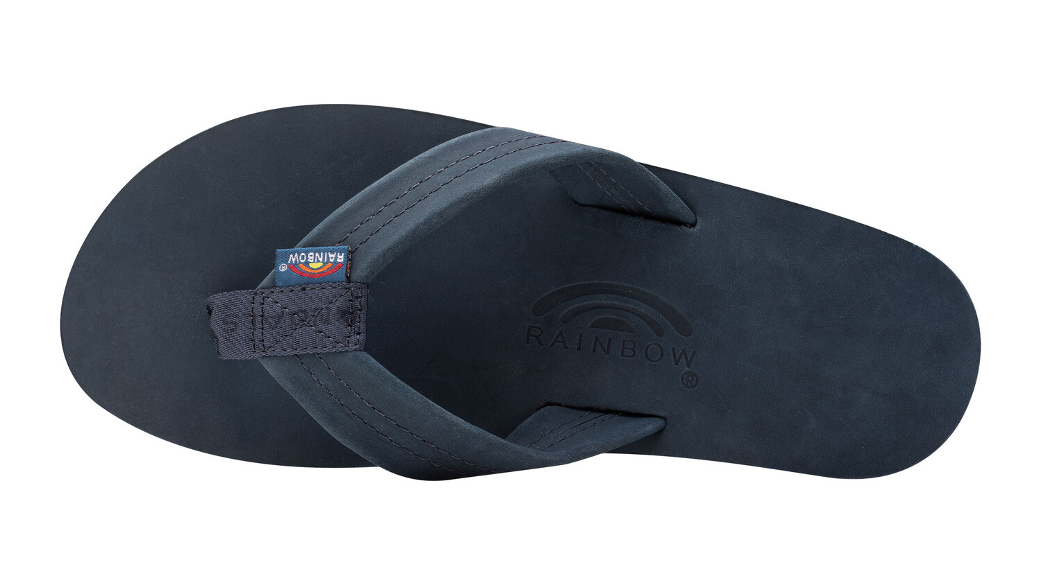 Однослойная кожаная сандалия премиум-класса изготовлена из нубука высшего сорта; на верхней части подошвы вытиснен логотип Rainbow. Ремешок, также из кожи нубука, прошит двойной строчкой, а нейлоновая деталь носка закреплена с помощью X-образного шва, при этом используется прочная нейлоновая нить.