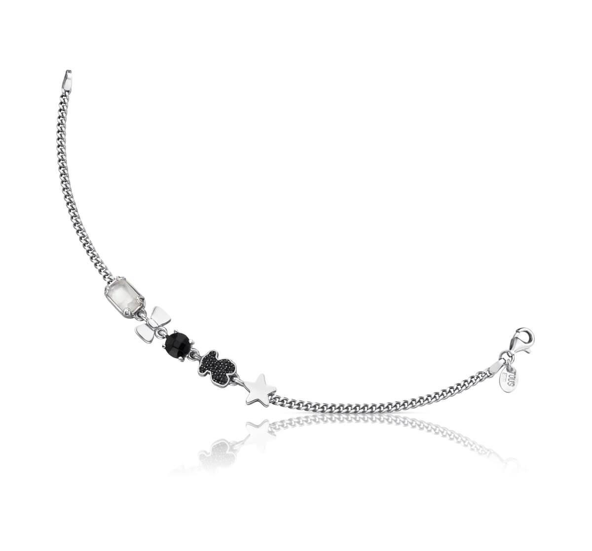 Возвышенная элегантность и простота могут создать самые классические и изысканные образы. Этот браслет просто идеален. Браслет TOUS из стерлингового серебра с ограненным ониксом, звездой из стерлингового серебра, гидротермальным кварцем, лентой из стерлингового серебра и медведем со шпинелью.