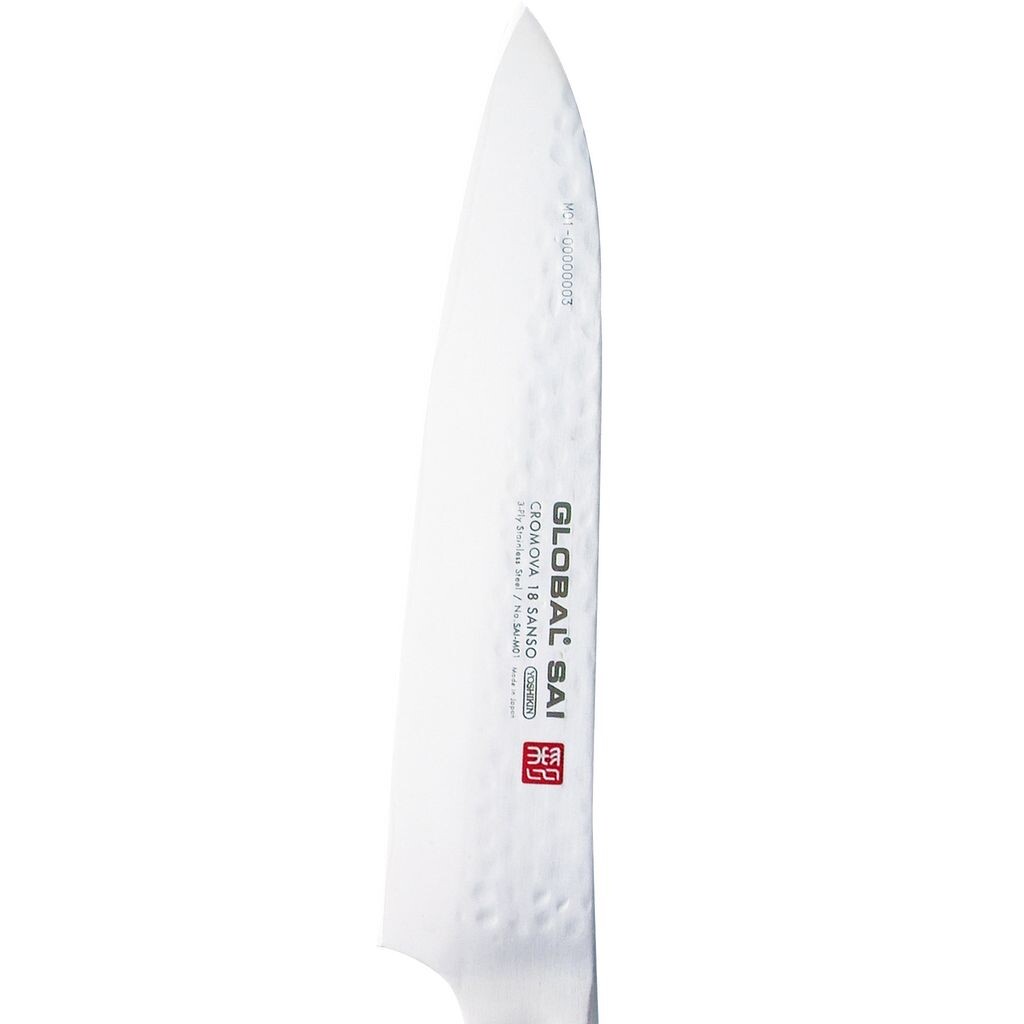 Ножи GLOBAL SAI Сделано Изготовлены по тому же традиционному методу производства, что и классические ножи Global, высококвалифицированными японскими ножовщиками в Йошикине. Global SAI отражает многолетний опыт Йошикина в производстве полых ручек из нержавеющей стали и острых как бритва лезвий. Как и классические ножи Global, ножи GLOBAL SAI также созданы известным японским дизайнером Комином Ямадой. Ямада имеет более чем 25-летний опыт разработки высококачественных ножей. Рукоятка ножей GLOBAL SAI имеет новый дизайн и впервые имеет опорную поверхность для большого пальца. чтобы обеспечить еще более плавную резку. Лезвия изготовлены из специального трехслойного материала CROMOVA 18 SANSO. Сердечник (режущая кромка) изготовлен из нержавеющей стали CROMOVA 18 твердостью 59 градусов по Роквелю. . .