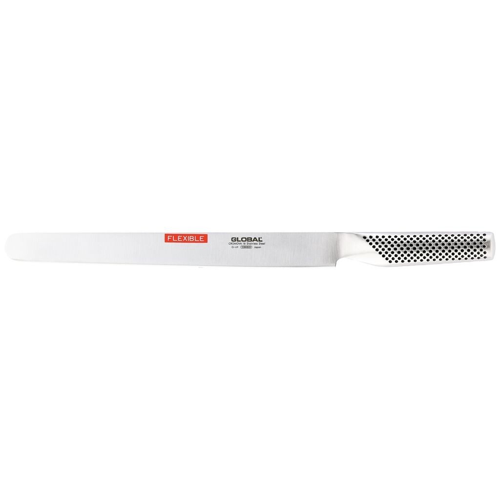 Нож G-69 Global Yoshikin для ветчины/лосося имеет лезвие длиной 27 см. G-69 можно использовать как нож для лосося, нож для ветчины или нож для мяса.