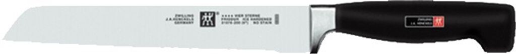 Нож для хлеба Zwilling 200 мм из серии «четыре звезды» Материал: изготовлен из специальной нержавеющей стали. Пластик Размеры: 200 мм (лезвие) С бесшовной пластиковой ручкой Со специальной зубчатой кромкой Идеально подходит для легкой нарезки хлеба, даже с твердой хрустящей корочкой.